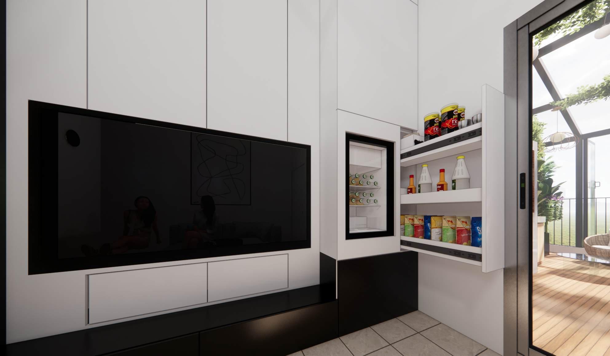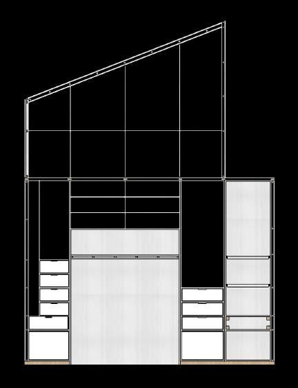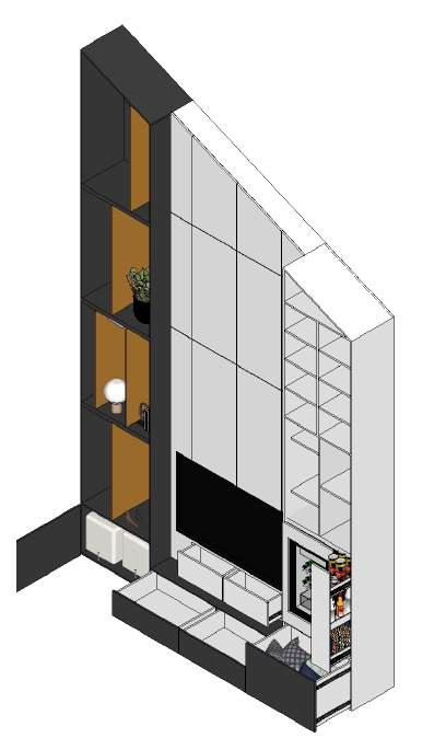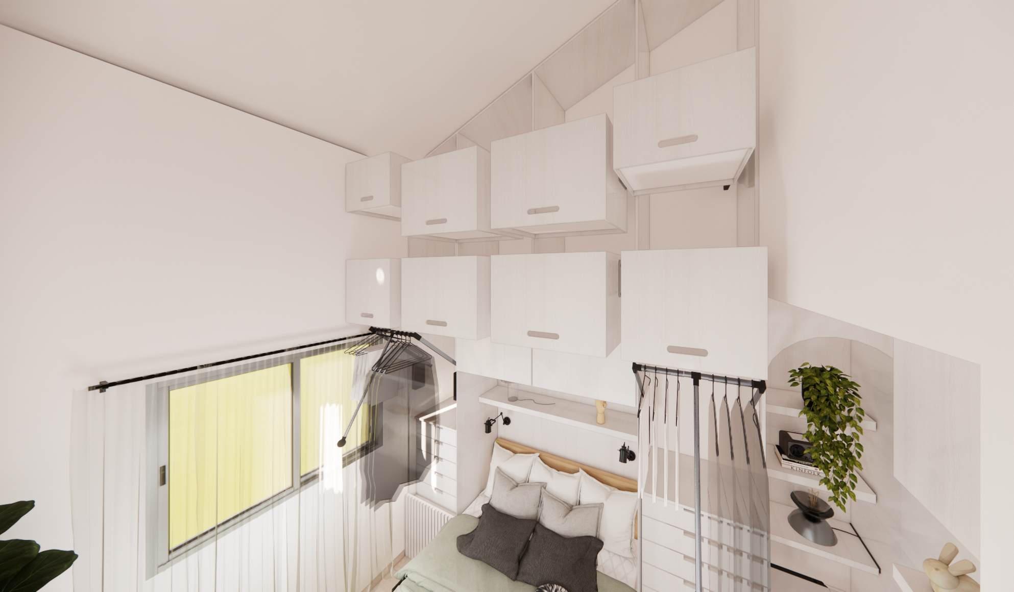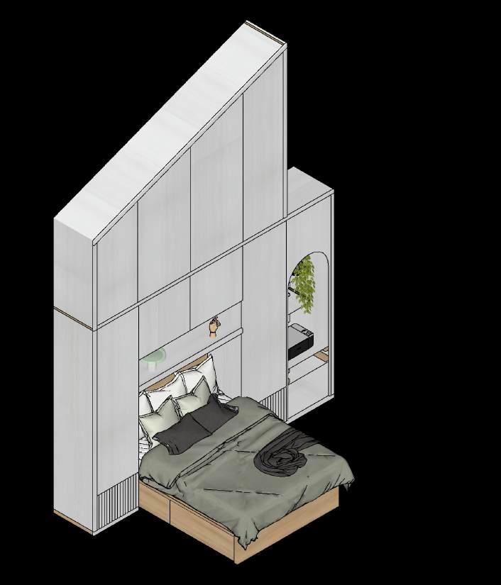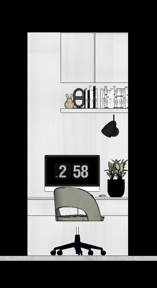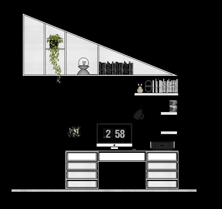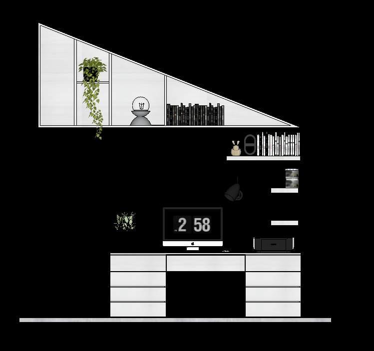 E n esta segunda fase se mantiene la línea de diseño inicial, continuamos con la remodelación y adecuación de los espacios faltantes, espacios que terminaran por completar el hogar deseado, subiendo por las escaleras encontramos dos habitaciones espejo, donde se logra aprovechar al máximo el área mediante la fabricación de muebles a medida enfatizando las dobles alturas y techo inclinado que el hogar nos provee, creando así un gran espacio de almacenamiento, se proponen: Closet, Mueble de Tv y escritorio, logrando una habitación acogedora y funcional.
