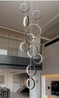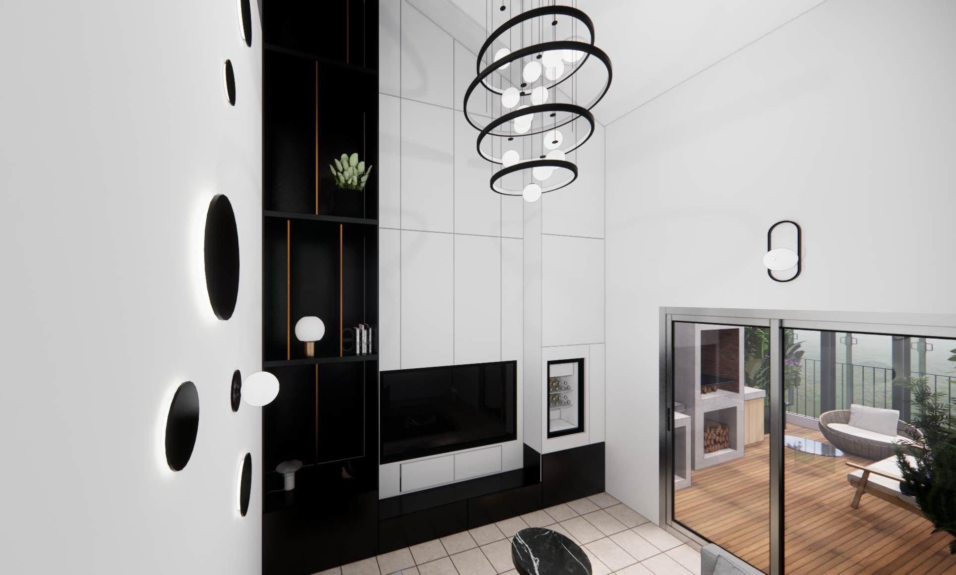A la izquierda, terminando el pasillo nos encontramos en la Sala de Tv enmarcado por el Librero/Estante fabricado a medida cubriendo la totalidad del muro frontal, enfatizando la monumental triple altura logrando una sensación de amplitud, la ambientación esta a cargo de un conjunto de luces de diferentes intensidades,en el muro de un costado se forma una figura astracta con las lamparas de ambientacion, siendo la pieza principal un candil de aros de luz que nos ilumina desde el centro del salón con una caída de poco mas de 1.50 m.