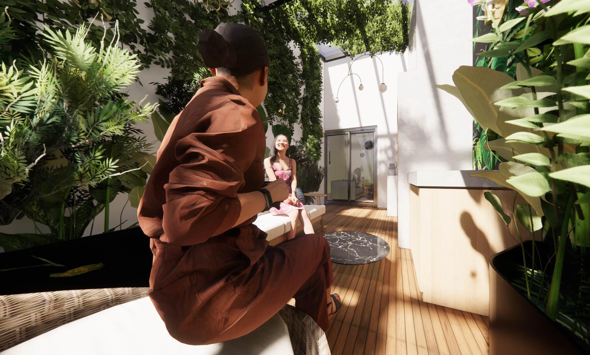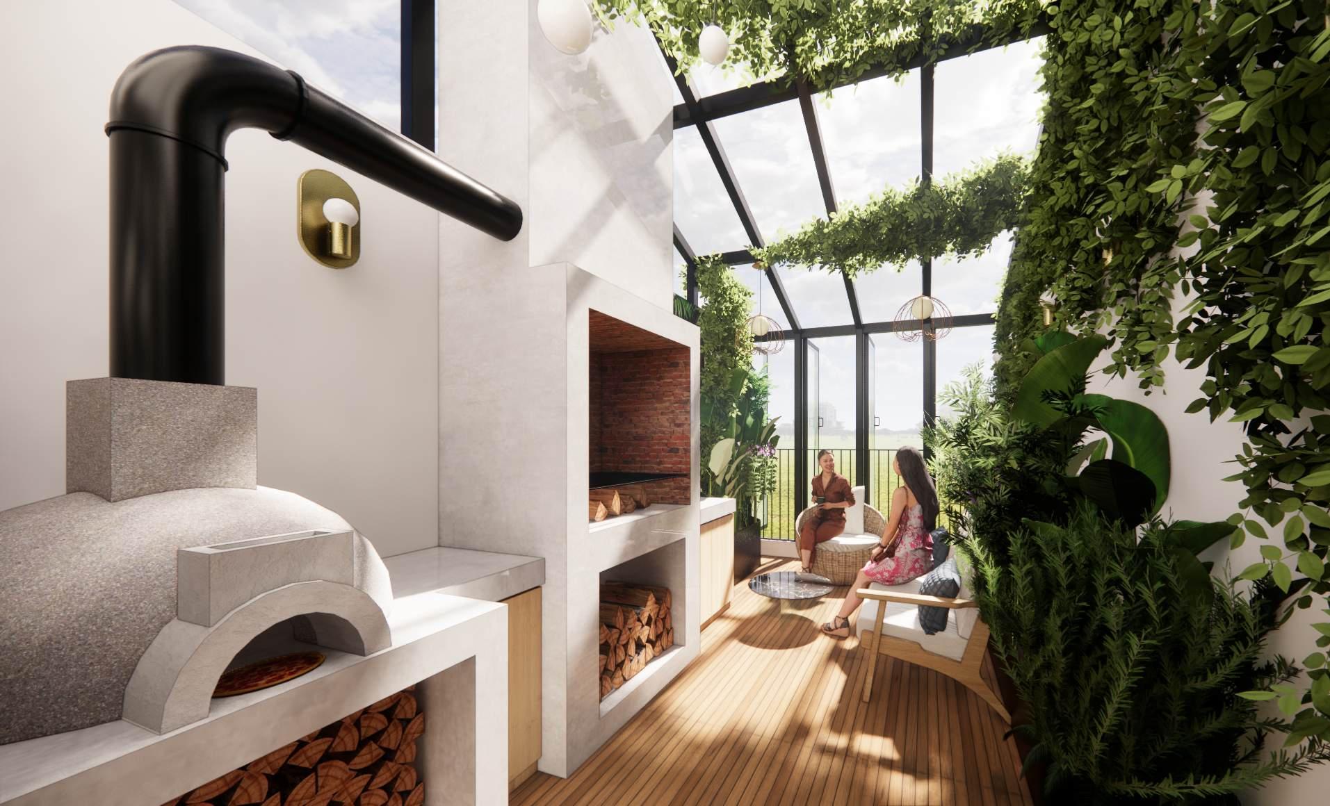 Despues un se asoman plantas verdes la terraza, creando un microclima fresco, lleno de vida un espacio para el pensamiento y la relajacion un espacio que espera por crear recuerdos, en un costado el espacio para preparar alimentos, ,como instrumentos una hermoso horno de leña acompañado con una asador argentino.