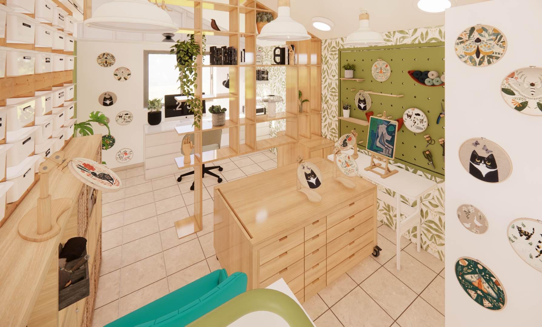 Ahora llegamos a la parte más alta de la vivienda, un espacio muy especial diseñado para el Arte y la Imaginación, aprovechando al máximo toda el área se ideo un Taller de manualidades y Estudio, usando como división un Estante que permite la circulacion de l aire y la luz , debajo una mesa de trabajo con Cajoneras que podemos mover y ajustar a como se deseé, un estante practico y versátil , un espacio intimo para crear.