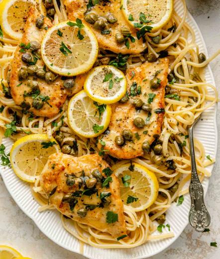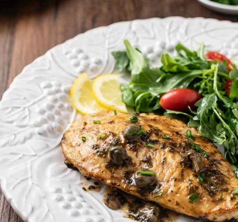 Step 3: Cook and stir minced garlic in the skillet until fragrant, about 20 seconds. Pour in chicken broth; scrape and stir any brown bits from the bottom of the skillet. Stir in lemon slices and bring the mixture to a boil. Let cook, stirring occasionally, until the sauce reduces to about 2/3 cup, 5 to 8 minutes. Add lemon juice and capers; simmer until sauce is reduced and slightly thickened, about 5 minutes more. Drop butter into the skillet and swirl it into sauce by tilting the skillet until butter is melted and incorporated. Add parsley; remove from heat and set aside.