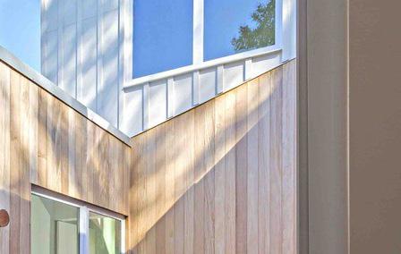 Prefabricated panels permit the assembly of a building more quickly and with fewer workers. The size of these panels makes them easily and affordably transportable, opening the world of prefabrication and therefore time-saving. Much like their 8-to-10-foot counterparts in traditional framing, these panels are linked with an alternating, double top-plate required to unite the individual panels into a single unit. The design does reduce material efficiency, requiring the doubling of studs at panel intersections to allow for additional joining. The window openings had to be shifted from the original design to fit within the boundaries of each 4-foot panel.