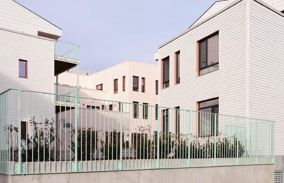At the scale of the house, units are paired twice: every residential building consists of two attached units that face another double, effectively creating an open court shared by four neighbors, which was deemed the optimal social network to ensure meaningful relationships between tenants. Each actively engaged cluster of four units, carefully located between the existing oak trees, is connected to a larger, central courtyard, connecting residents with an intentional community while still maintaining an open relationship with the surrounding neighborhood.