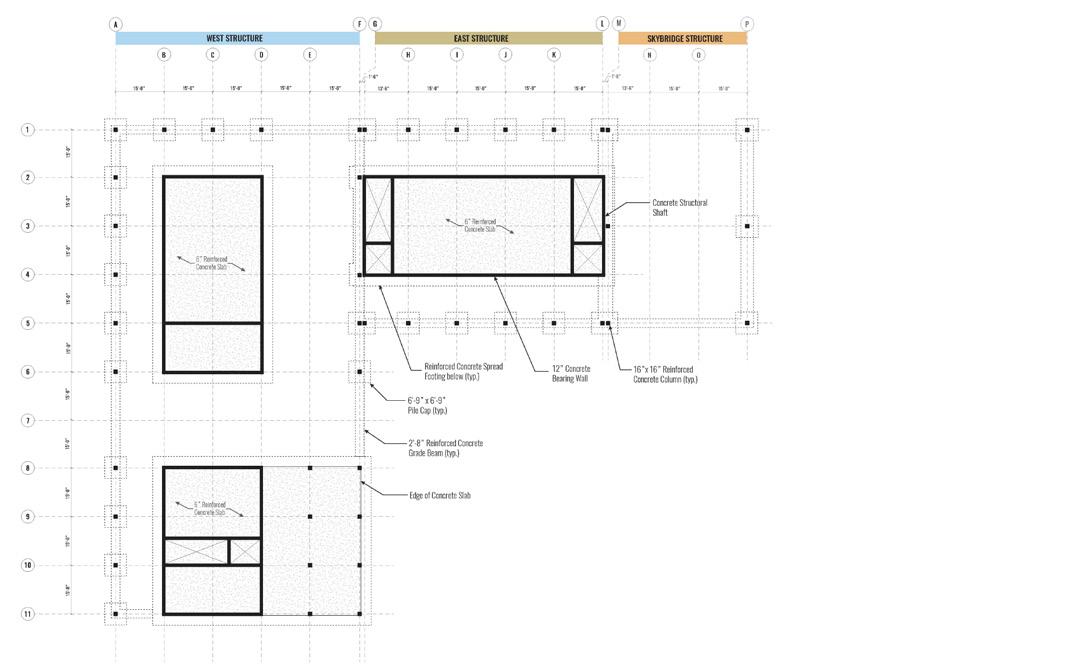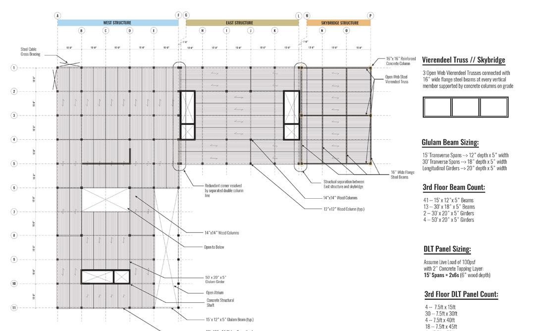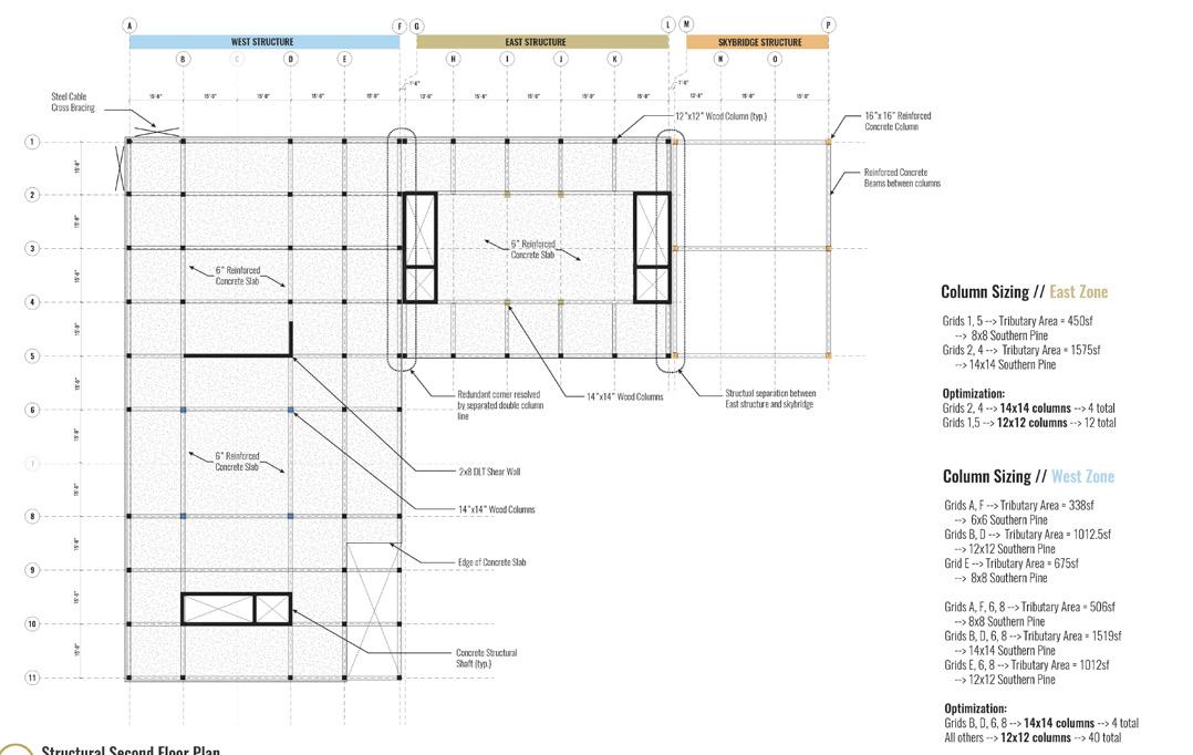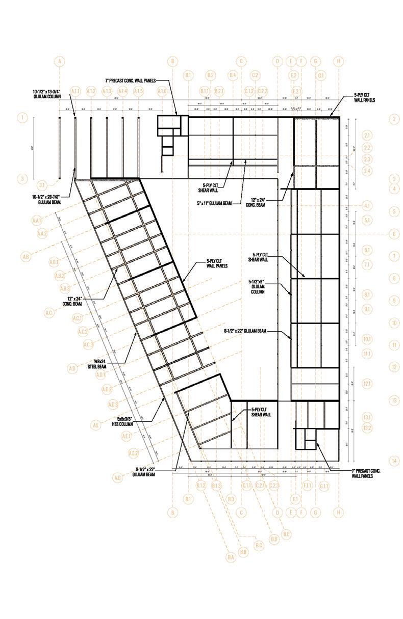 335 SUPERTEAM 4 A B C D 2 4 6 7 8 9 10 11 12 13 ADDITIONAL NOTES 30’ 0” 30’ 30’ 15’ 0” 15’ 0” 15’ 0” 15’ 0” 15’ 0” 14’ 3” 15’ 7” 11’ 15’ 0” 15’ 0” 15’ 0” 8’ 8” BASE COMMAND CENTER FOUNDATION FRAMING PLAN CONCRETE SHEAR WALL CORE 60 X 60 X 24 CONCRETE FOUNDATION PILES 6” CONCRETE SLAB W/ FOOTINGS CONCRETE SHEAR WALL CORE 6” CONCRETE SLAB W/ FOOTINGS 51 CONCRETE PILE CAPS 2 CONCRETE SHEAR WALL CORES 39 CONCRETE COLUMNS 2 CONCRETE FOUNDATION SLABS 85 CONCRETE GRADE BEAMS 204 CONCRETE PILES FOUNDATION AND GROUND FLOOR FRAMING PLAN ADDITIONAL NOTES A B C D 1 2 3 4 5 6 7 8 9 10 11 12 13 30’ 0” 30’ 0” 30’ 0” 15’ 0” 15’ 0” 15’ 0” 15’ 0” 15’ 0” 14’ 3” 15’ 7” 11’ 15’ 0” 15’ 0” 15’ 0” 8” BASE COMMAND CENTER LEVEL 1 FRAMING PLAN 30 15 X 30 15 30 15 30 15 30 15 30 15 30 15 30 30 15 30 15 30 15 30 15 30 15 X 30 15 30 15 30 15 30 15 30 15 30 11 30 15 20 11 20 15 X 30 15 30 15 20 9 10 20 4” STEEL CROSS BRACING EXTERIOR & INTERIOR STARS TO BELOW DOUBLE HEIGHT SPACE @ 30’ CONCRETE SHEAR WALL CORE DOUBLE HEIGHT SPACE @ 30’ CONCRETE SHEAR WALL CORE STAIRS BELOW 6” X 18” CONCRETE BEAM, TYP. 12” X 12” CONCRETE COLUMN, TYP. STAIRS BELOW MEZZANINE ABOVE GRADE @ 15’ 6” CONCRETE SLAB W/ FOOTINGS 2 CONCRETE SHEAR WALL CORES 39 CONCRETE COLUMNS 21 HORIZONTAL CONCRETE BEAMS 25 VERTICAL CONCRETE BEAMS 4 STEEL CROSS BRACES 6” X 18” GLULAM BEAMS 9 HORIZONTAL GLULAM BEAMS 12 VERTICAL GLULAM BEAMS SECOND FLOOR FRAMING PLAN ADDITIONAL NOTES C 1 2 3 4 5 6 8 10 11 12 13 30’ 0” 30’ 0” 30’ 15’ 0” 15’ 15’ 15’ 0” 15’ 0” 14’ 3” 15’ 7” 11’ 0” 15’ 0” 15’ 15’ 8” BASE COMMAND CENTER LEVEL 3 FRAMING PLAN 5 30 15 30 15 30 15 X 30 15 30 15 30 15 30 15 30 15 30 15 30 15 30 15 30 15 30 15 30 30 30 15 30 15 30 30 11 30 15 30 15 30 15 X 30 15 30 15 30 15 30 4” STEEL CROSS BRACING CONCRETE SHEAR WALL CORE STAIR BELOW 10’ X 15’ CLT FLOOR PANELS THIN 5 PLY THICKNESS & 2 1/2” CONCRETE TOP LAYER 8” X 8” WOOD COLUMNS 6” X 18” GLULAM BEAMS CONCRETE SHEAR WALL CORE STAIRS BELOW 2 CONCRETE SHEAR WALL CORES 33 HORIZONTAL GLULAM BEAMS 44 VERTICAL GLULAM BEAMS 4 STEEL CROSS BRACES 39 GLULAM COLUMNS 84 CLT FLOOR PANELS