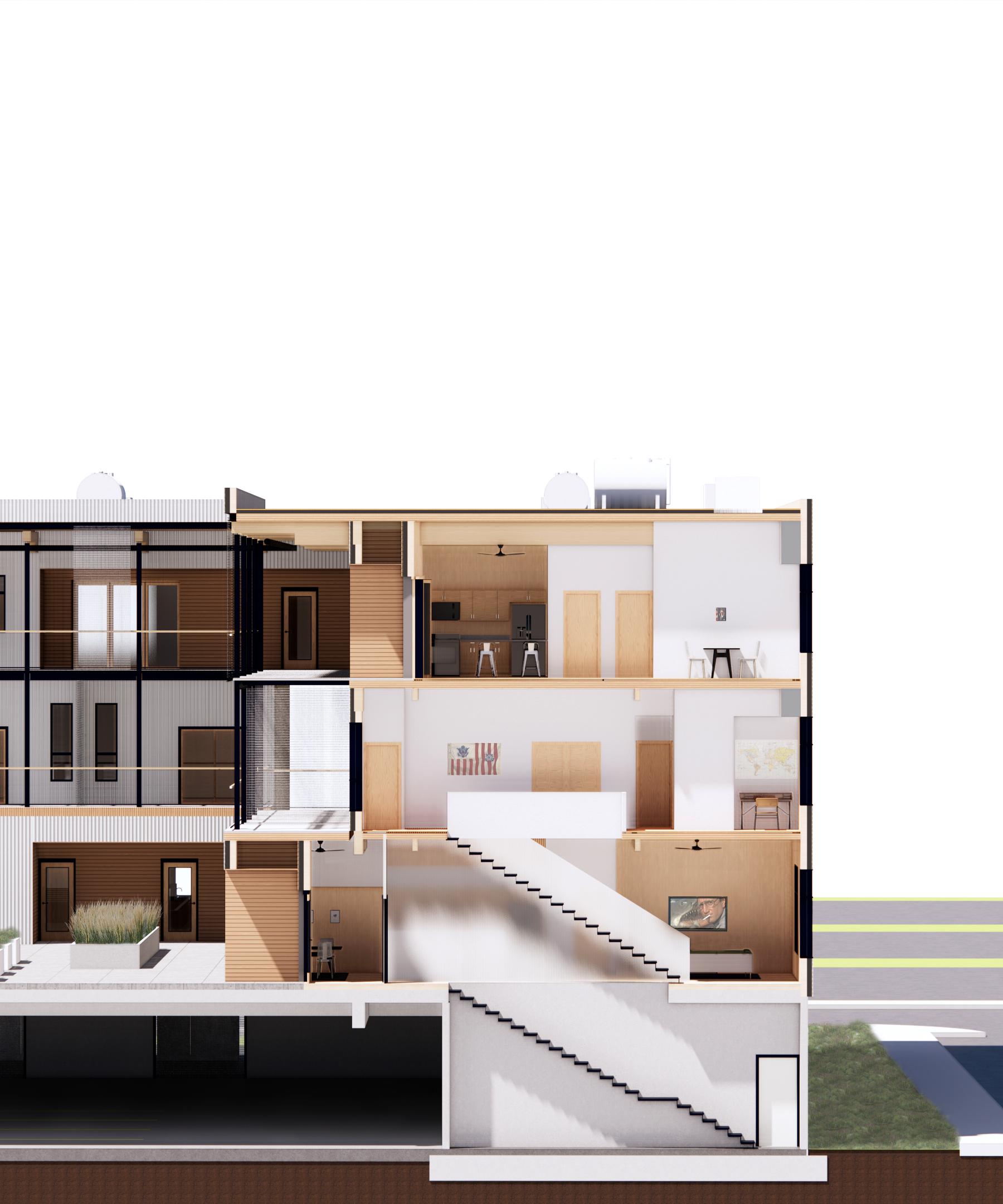 One of the main underlying goals of the United States Military is to construct a healthy and effective base operation by building community and fostering camaraderie among military personnel and their families. This ground-up ideology starts at home, and its effects ripple throughout the rest of the base. Thus, it is critical to the design success of a multifamily housing complex at the Charleston Coast Guard Base to consider this fellowship and camaraderie. By orienting the interiors of the units around shared areas, providing large transitional zones between private and public spaces, and integrating a multitude of programmed communal regions throughout, this building will inspire as much engagement as possible among occupants and thus enhance the overall operation of the base