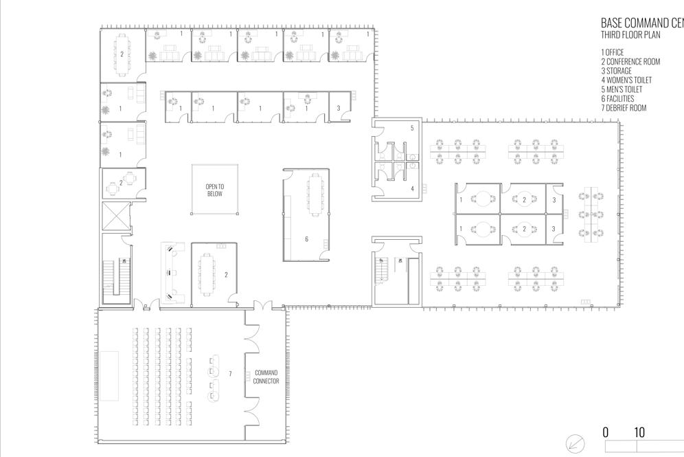 Base Command is the permeable programming of the proposed FLETC/USCG site that moves users, water, light, and the HVAC system throughout its cores to disperse users to their desired location. It provides a place of connection and airiness within the communal dining center located in the southern mass. The cores also act as circulation centers to divide users from public to private spaces while maintaining a sense of security associated with the Base Command and Sector Command. A sky bridge connects the base and sector command to allow for shared programming. The base command structure consists of a concrete foundation, beam, and column system, that transforms into an aesthetically pleasing timber glulam system with five-ply CLT floors and a three-ply CLT roof—finishing off with a curtain wall system that wraps the entirety of the structure. These decisions allow for a visual and physical connection for the public and private users of the site.