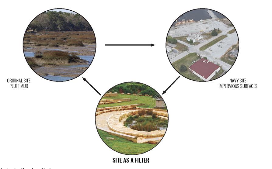 Our design planning sought to address four concerns: unaddressed flooding, parking, a reduction in building frontage, and the role of green space as a filler. We studied our proposal as both a logical next step in the evolution of the site and an ecologically responsible path to the site’s future. The Coast Guard Headquarters in Washington, DC, was used as a precedent case study to develop strategies to filter and manage water, grade the site, and incorporate native landscapes in courtyards. The strategies we relied on the most from this case study were green roof water collection, stormwater gathering areas, filtration systems, and regional landscaping.
