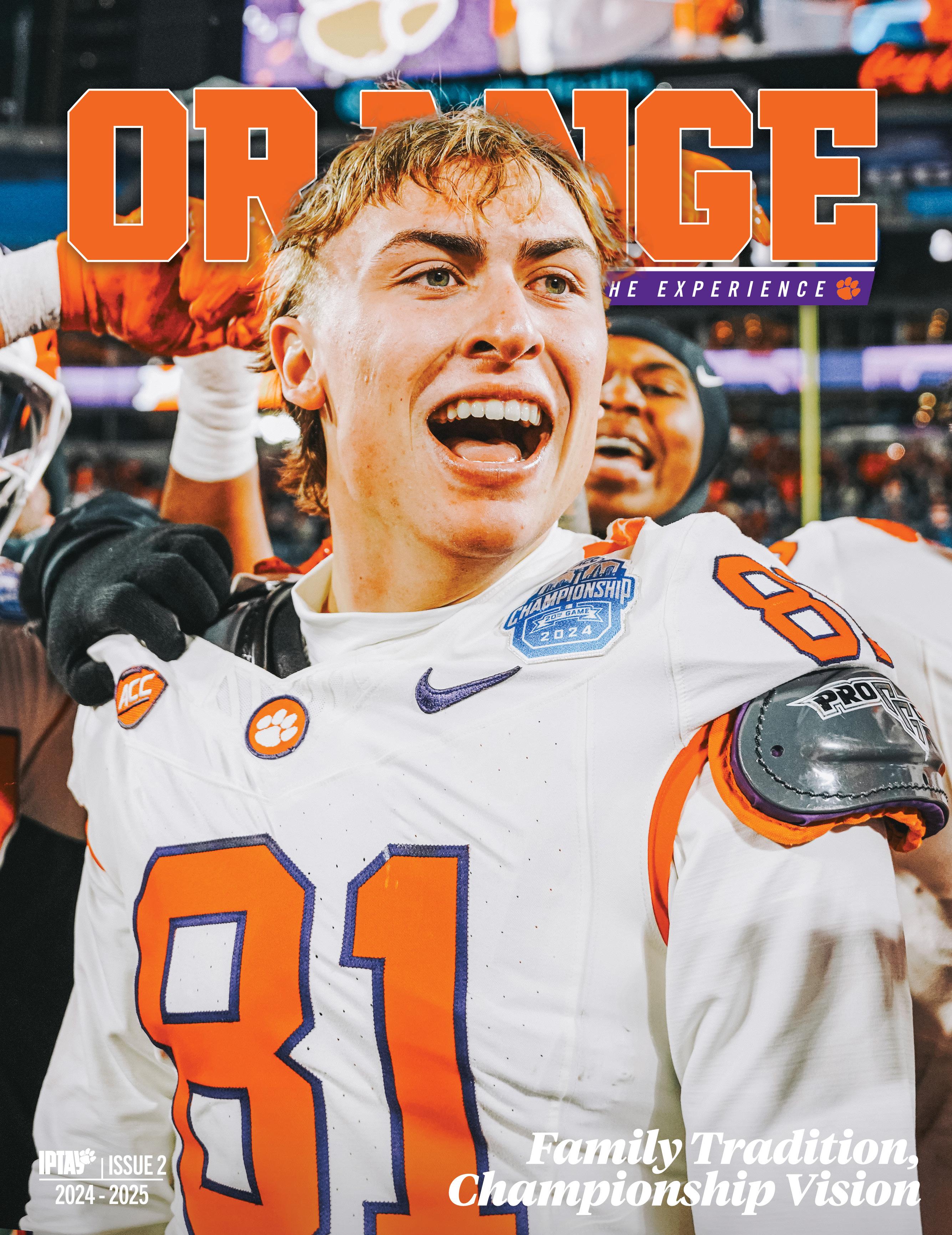 Orange: The Experience is published four times annually exclusively for donors to the IPTAY Scholarship Fund. A minimum priority contribution is $60, but contributions of all amounts are welcome. To join IPTAY or renew your membership, call 864-656-2115 or log on to ClemsonTigers.com/IPTAY. To advertise in this publication, contact Mike Money by email at mmoney@clemson.edu.