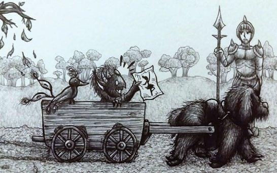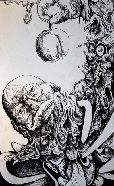 I use ink as my primary drawing medium when I want to render specific textures, dark values or attain a graphic style of drawing. I paint in a surreal style to explore color interaction and consider how my creatures would blend into their surrounding environments. By sculpting them, I capture more details, movements and expressions that I would not otherwise be able to depict in a twodimensional illustration.