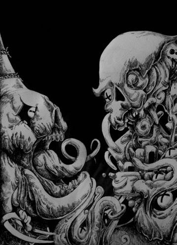 Most of the pieces I do are black and white ink drawings. I use ink because I enjoy adding texture and depth through black and white visuals. Ink is the most familiar to me—it is simple, but you can do so much with it. I use color very sparingly. If I add color to something it is because the piece needs it. I enjoy using other mediums and trying new things out, but I always go back to the pen and paper, the things I am most used to.