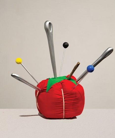 Molly Zickes, Pin Cushion , Foam, cloth, rope, cotton filling, plaster, wood, bronze, 2022