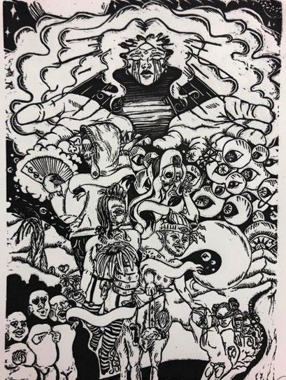 Since before I can remember, I loved drawing. I love the freedom of doing it and how I can escape from the world by focusing on what I want to put on paper. The most planning I do when I draw my pictures is to make basic shapes to form a composition that I feel is visually pleasing. I then let my hand and my brain do the rest of the work. I do not have a theme or meaning in my mind before I create a piece. Sometimes I do not know the meaning of my work until I finish it and take a step back to look at it. It could take me days to find some meaning in my drawings and on some occasions, I never see anything. My pieces are more of a visualization of my feelings at the time of doing them and many people interpret them differently—and I am personally fine with that.