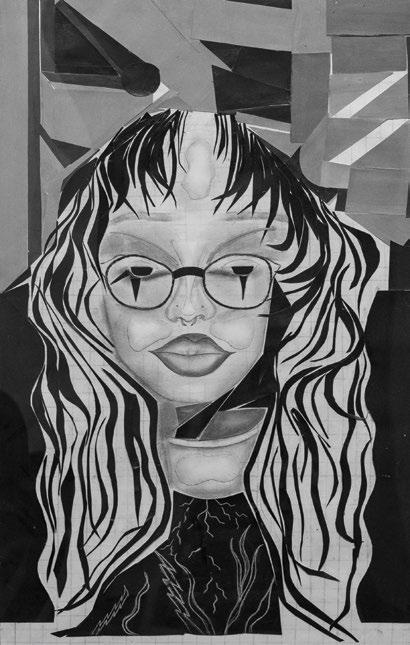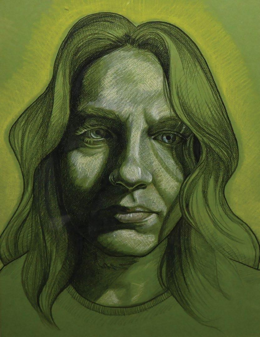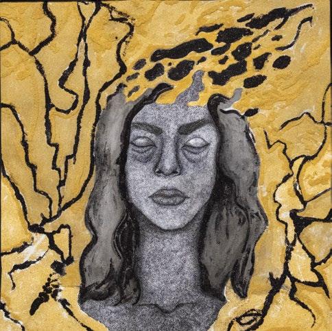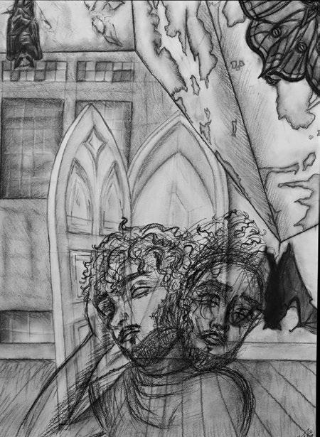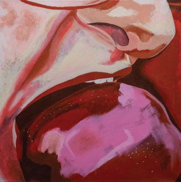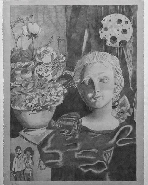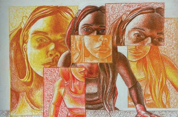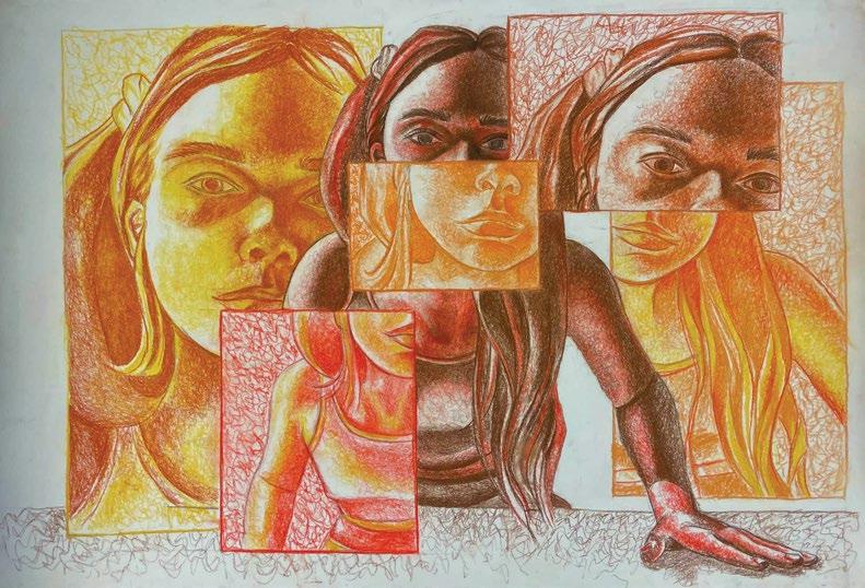 In this selection of works, I aim to convey a thematic concentration of ideas that express my struggle with femininity and selfperception, as well as showcase my recent experimentation in media, composition and scale. I have continually, throughout my development as an artist, found myself the most invested in the expression of my mental battles and torturous insecurity, which I have developed as a result of looming expectations of beauty, social relationships and success. I aim to synthesize the expression of these emotions through the gesture of figures and facial expressions of portraits, using their interaction with the composition to directly address the viewer. By juxtaposing bright, bold colors and lines with the depressive intensity of facial expression, I create contrast in the imagery that demonstrates the duality of the pain of internal mental battles that have been forced under a facade of perceived beauty.