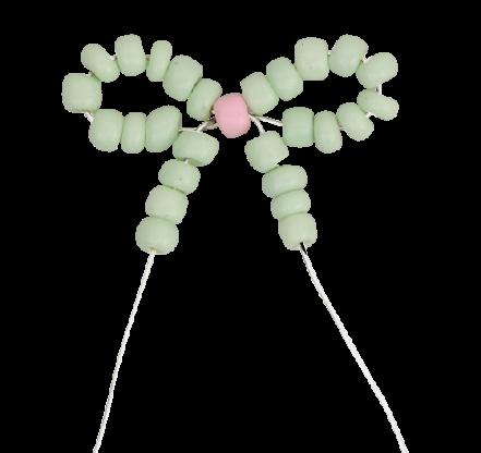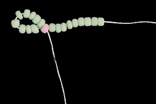 2. Choose the coloured barrel beads you’d like to use for your banner in advance. Use the template on page 8 as a guide or create your own design. Thread your beads for the first column onto both strands of thread.