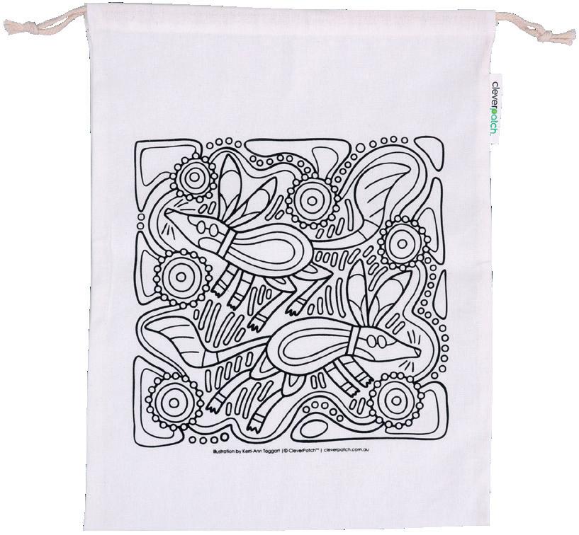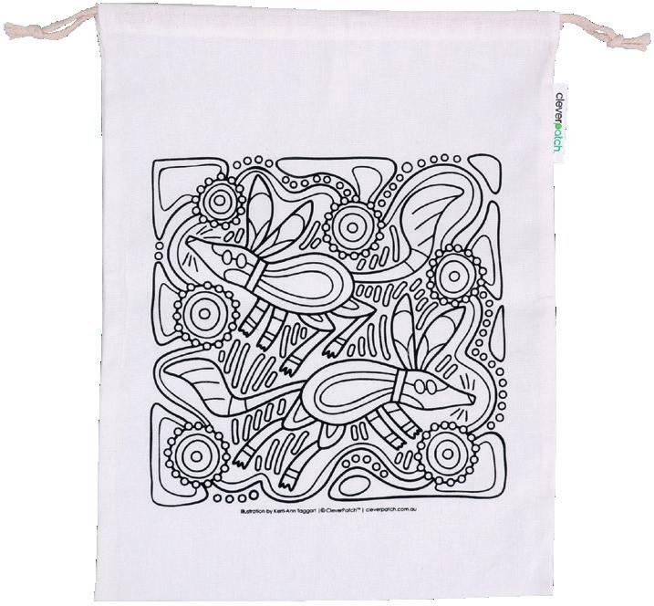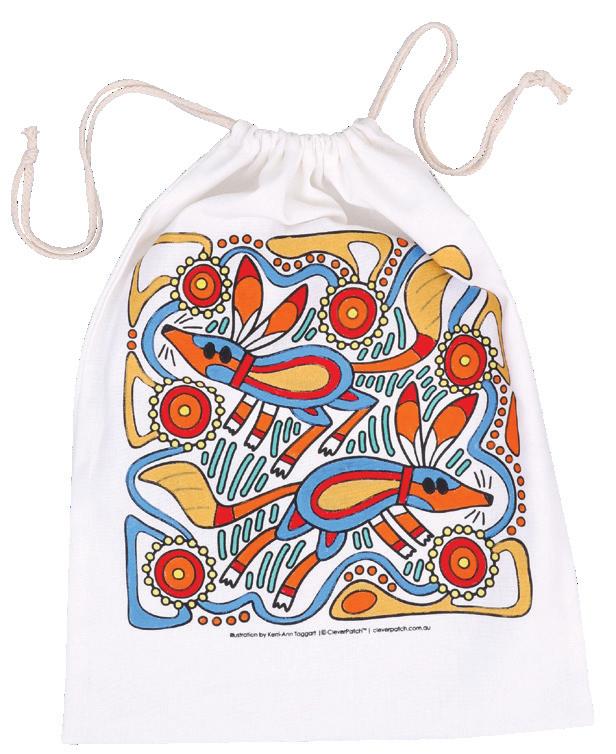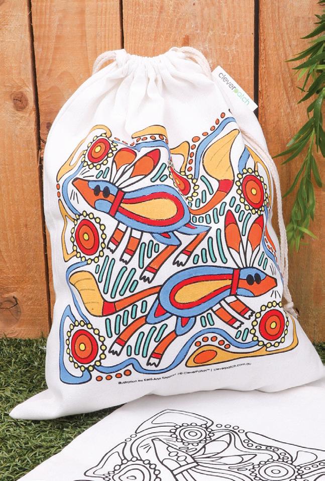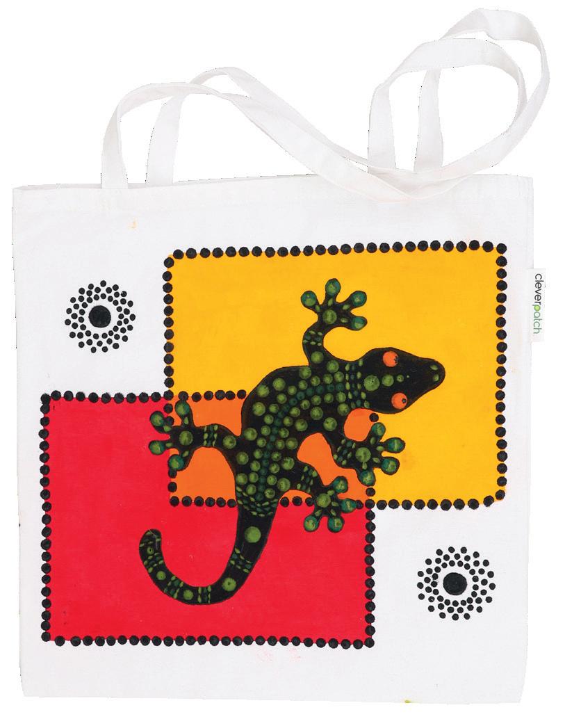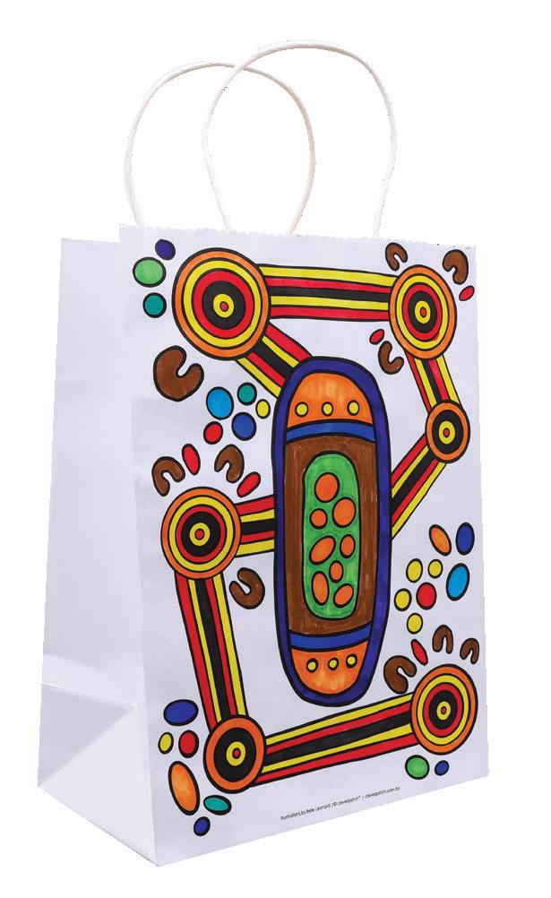 Designed by Aboriginal artist Belle Leonard. Includes a different pre-printed design on the front and back of the bag. Plain for you to create. Measures approximately 19.5 x 11 x 26.5cm (not including handles).