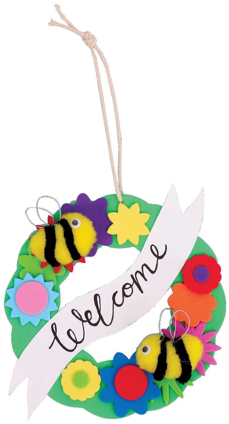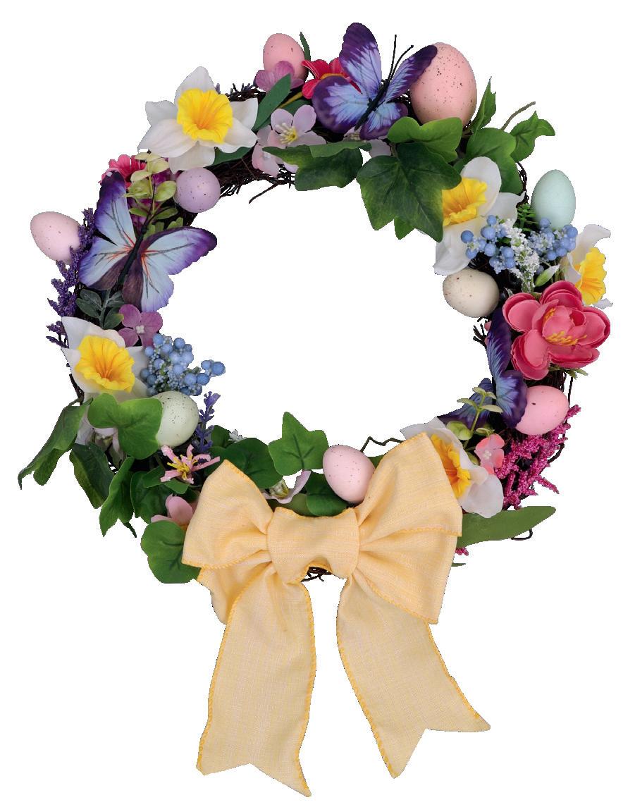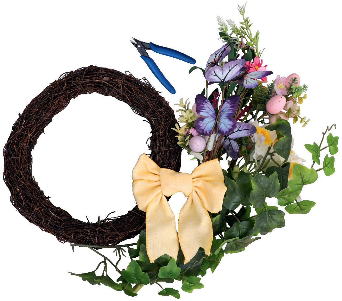 Kit includes rattan wreath, linen bow, diagonal cutters, assorted artificial flowers and greenery and Easter egg picks. Rattan wreath measures 30cm in diameter. Contents will vary.
