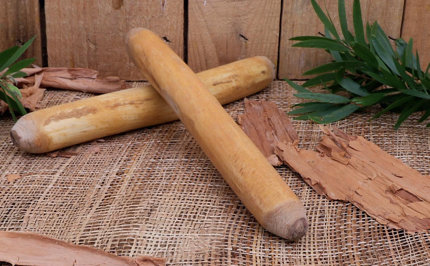 Aboriginal and Australian made. Traditionally used to create music, and usually played along with the didgeridoo. Wood sourced from the region of Binaal Billa, handmade by Wiradjuri people. Measures approximately 2.5cm in diameter and 28cm long. Each piece is unique, made from natural wood with individual faults and lines. Colour, shape and size will vary.