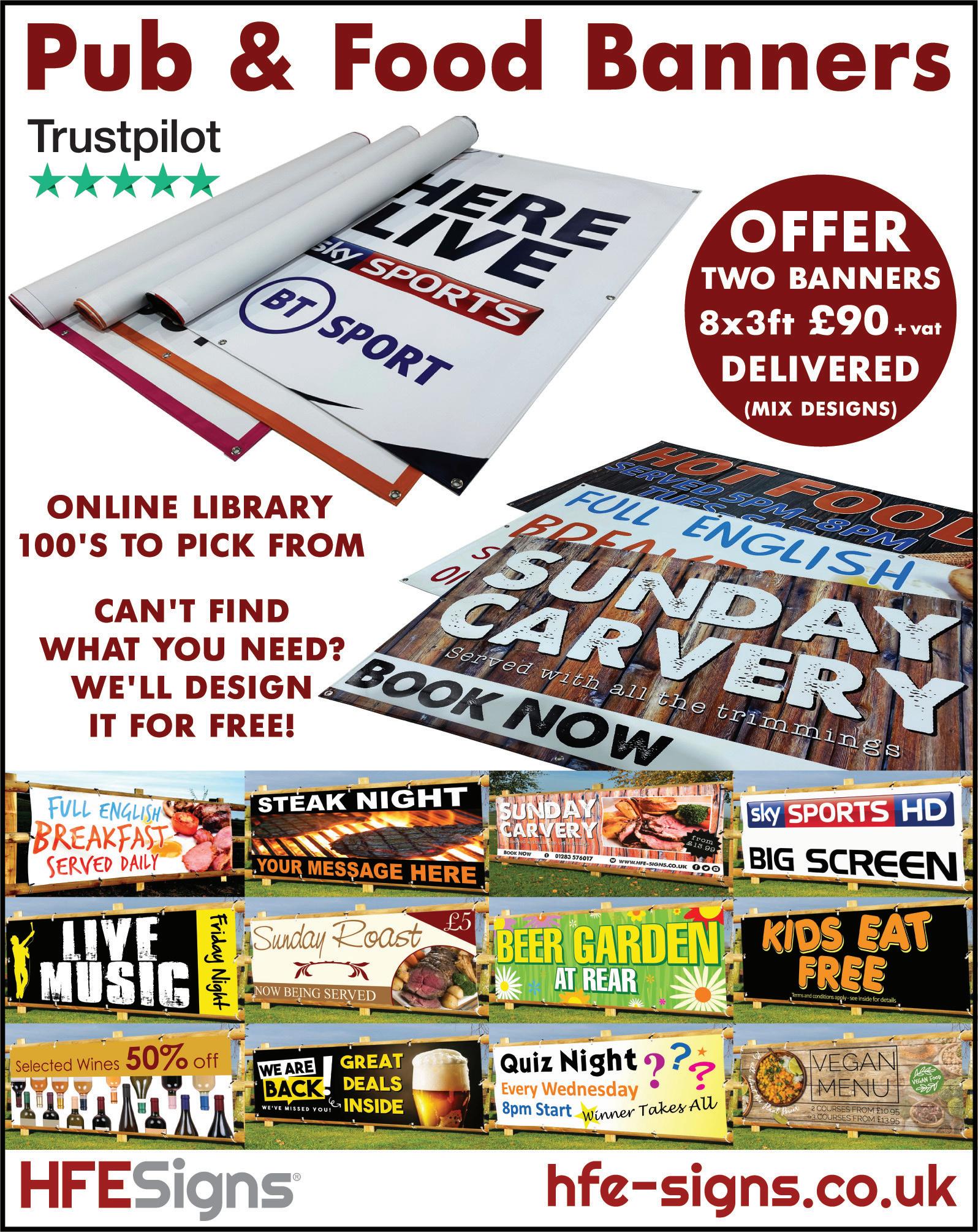 For over two decades, HFE Signs has been helping pubs, restaurants, and cafés shout about what makes them special. Their high-quality pub & food banners are the perfect way to grab attention, drive footfall, and get your message out to the people who matter – your customers.