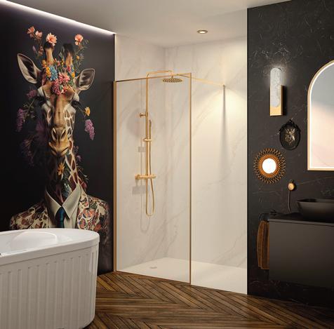 Deco glass from the Solo Design + range features a stunning gold pattern which partners beautifully with the brushed gold profile.