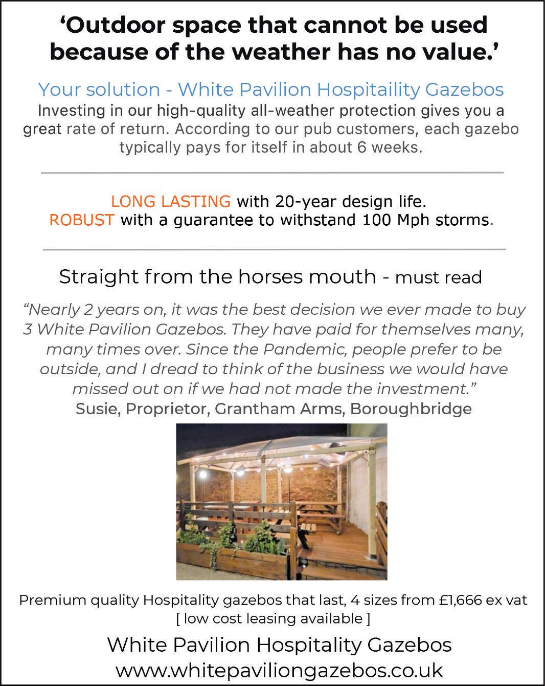 Under Class G of The Town and Countr y Planning (General Permitted Development) (England) (Amendment) (No 3) Order 2021 the operators of pubs bars hotels and restaurants can sig nificantly increase footfall, and thereby profits, by erecting a mar quee or gazebo on their premises, running a pop up bar in a beer garden or any other moveable structure As a result, popu lar spor ts matches, large wedding par ties and a wide variety of events can attract greater numbers of patrons for hospitality venues