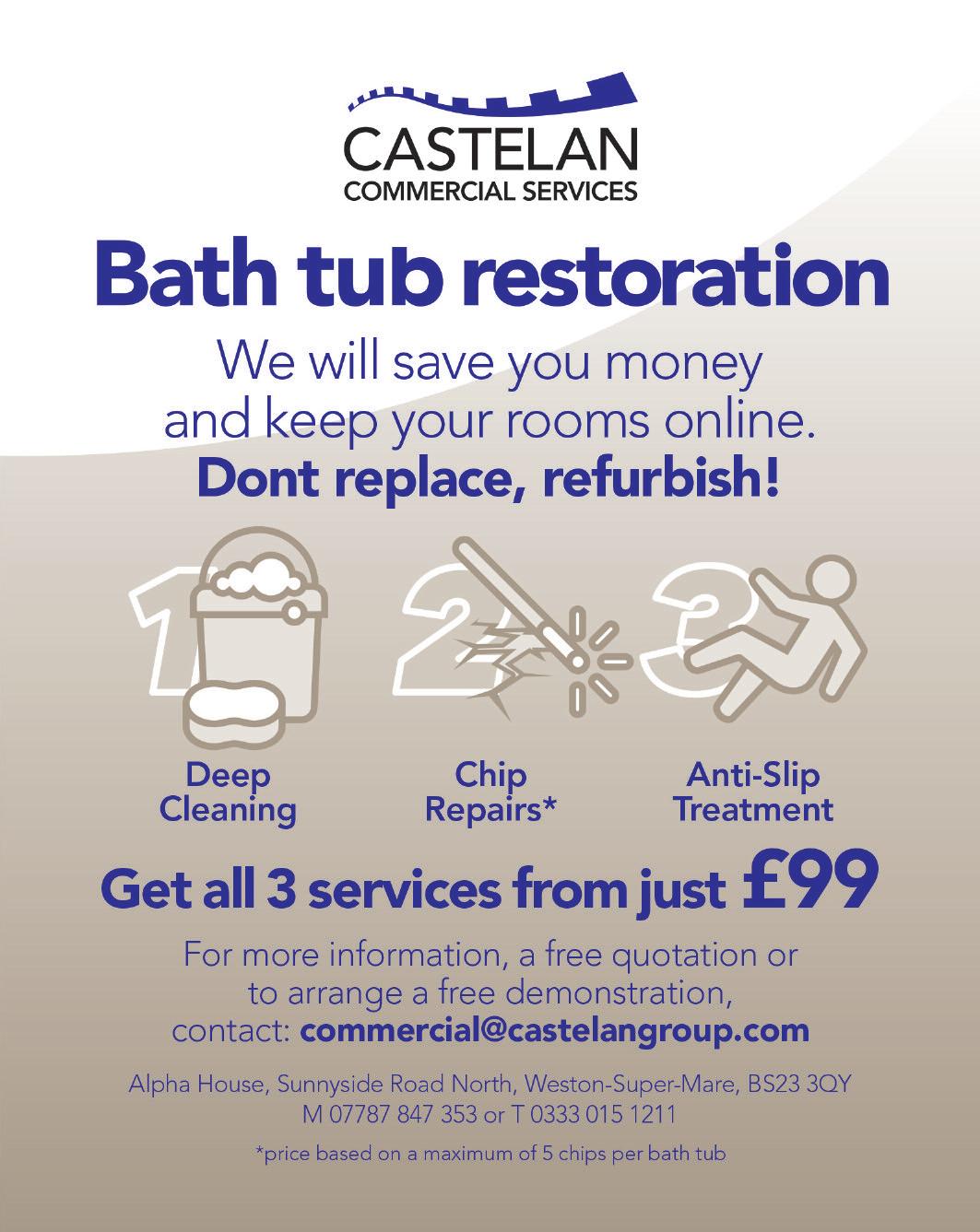 Castelan Commercial Ser vices are now the ‘go to’ Company for Bath Tub Restoration work They cover the whole of the UK and use modern day innovative techniques to achieve results not seen before within the Hospitality Industr y that will extend the life of your fixed assets