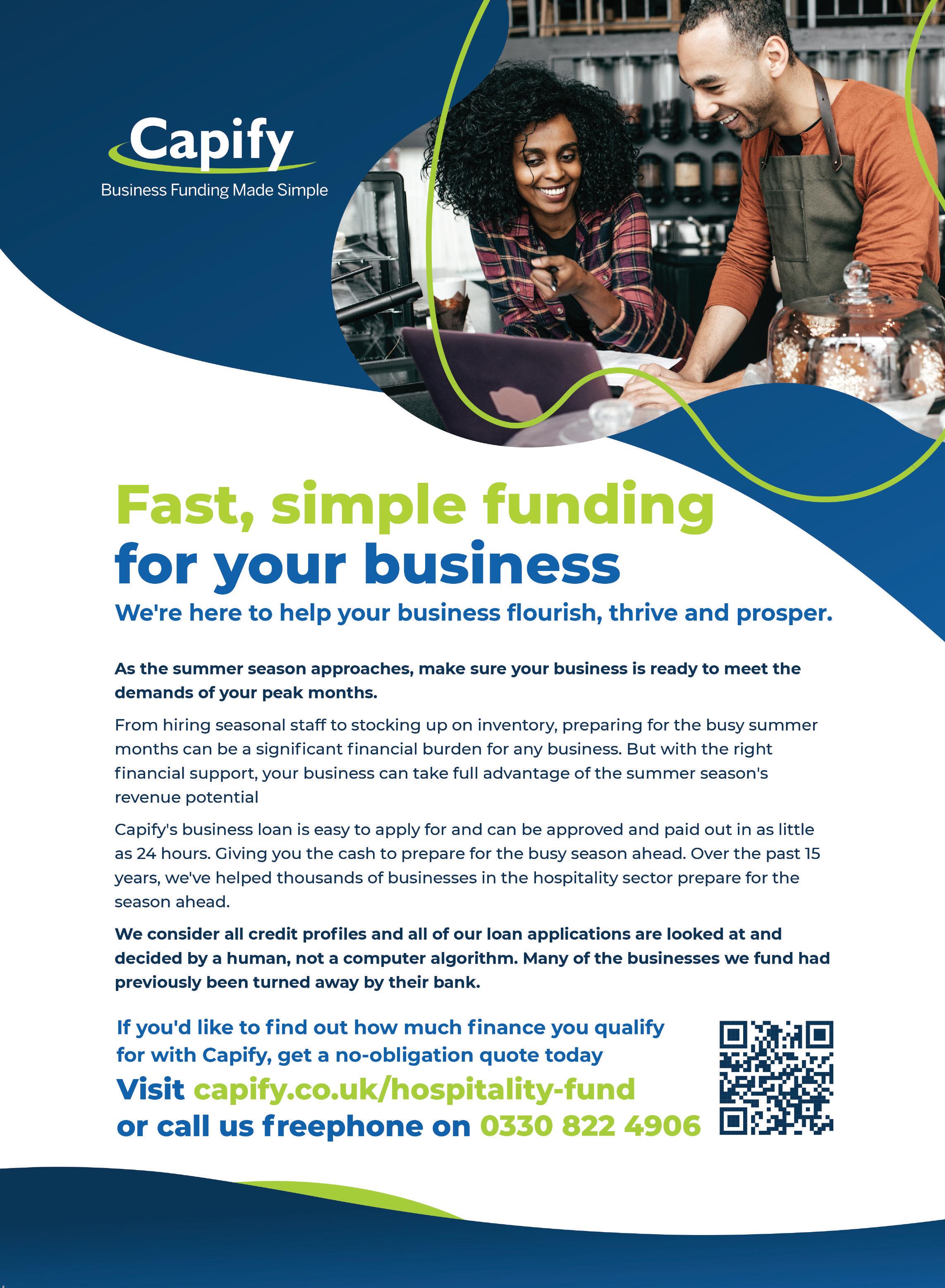 At Capify we offer a range of business loans to help suppor t small businesses throughout their growth journey Check to see if you re eligible for one of our loans by visiting www capify co uk Or, if you’d prefer to talk to a member of our team, we’d be happy to guide you through the process Give us a call today on 0330 822 4906 or see the adver t on page 17