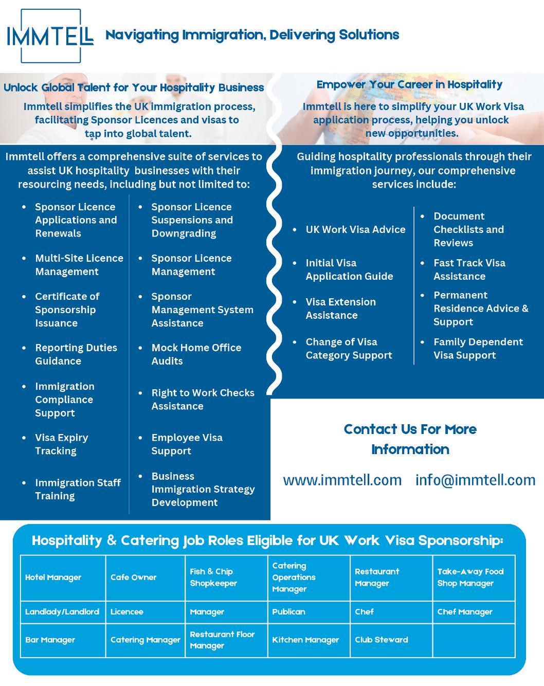 At Immtell we understand the unique challenges that the UK's catering and hospitality industr y faces particularly in staffing We are here to help you bridge these gaps by unlocking global talent, bolstering your workforce , and driving your business forward