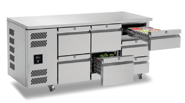 The Jade’s customisability is exceptional. Williams can offer a huge range of options so that the specifier can get exactly the counter they need for their precise application. They include raised pan holders and cut out wells to hold ingredients as a prep station; drawers instead of doors, in banks of either two or three; and a choice of counter height. Both refrigerated and freezer Jade counters are available in three sizes, two-, three- and four-door, with capacities of 317 litres, 469 litres and 622 litres respectively. All are designed to accommodate 1/1 GN shelves.