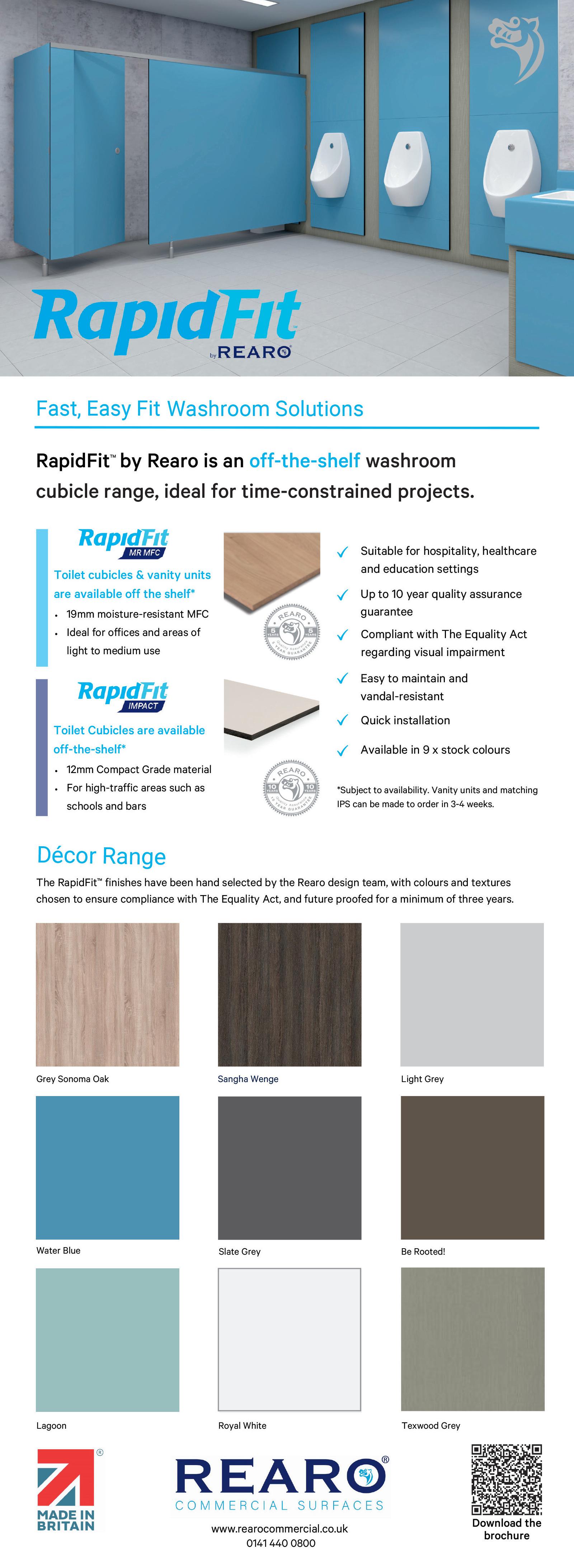 • Durability: Options for both light and heavy-duty use. Contact your local fitter, joiner, or plumber to request free sample packs and design assistance. Or order your RapidFit washroom directly today. commercial@rearo.co.uk www.rearocommercial.co.uk
