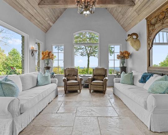 layered, southern vistas. Open dining with adjacent Chefs Kitchen of the highest quality appliances and finishes. Primary suite flows into the opposite wing of the house with a double bath and full office library. There is an elevator and a stairwell that leads to 2 guest bedroom suites, and a bonus room completes the upstairs. A rear porch with pet fence and a 2-car garage complete this family home. Additional goodies are a generator, push button multi control lighting systems, pure well water, huge boulders and landscape walls. ■