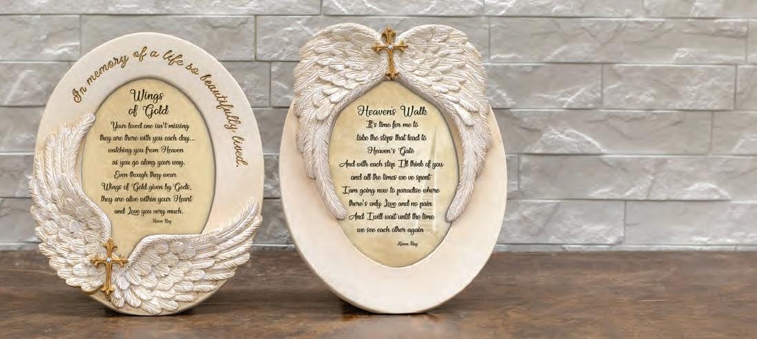 Angel Frame Minimum Quantity 1 [24C-015-50] © Karen Ray WGF1 )03799-JEEJAi Angel Frame Minimum Quantity 1 [24C-015-50] © Karen Ray Frame Size: 11.5” x 7.5” Holds a 6” x 4” photo The frame can be displayed tabletop or hung on wall. Stepping Stone Size: 11” x 11” x 0.75” You can place these stepping stones on an easel, indoors or outside on a garden path. They are durable and beautiful while serving as a reminder of loved ones. STPSR2 )03799-JEEIIf Angel Stepping Stone Minimum Quantity 1 [24C-022-00] © Karen Ray STPSR1 )03799-JEEIGb Angel Stepping Stone Minimum Quantity 1 © Karen Ray Wings of Gold COLLECTION Designed and Finished in the U.S.A. Christian Products