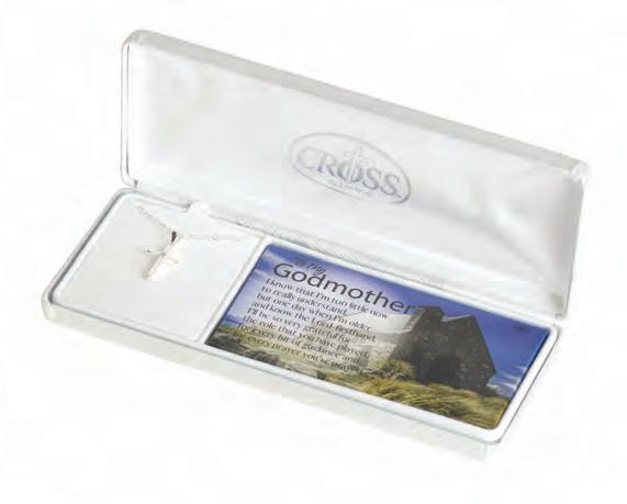 73-8090P Silver Plated Box Cross with CZ stone measures 11/16”. Cross has tapered edges and hangs from an 18” chain. Packed in a white hinged box with poem insert which reads: “I know that I’m too little now to really understand, but one day when I’m older and know the Lord firsthand, I’ll be so very grateful for the role that you have played, for every bit of guidance and for every prayer you’ve prayed.” Makes the perfect gift for the baby’s Godmother.