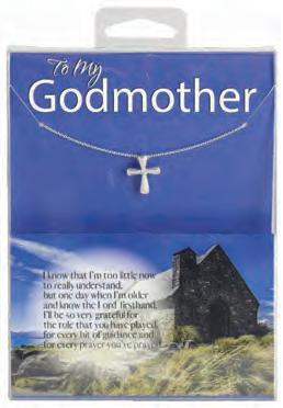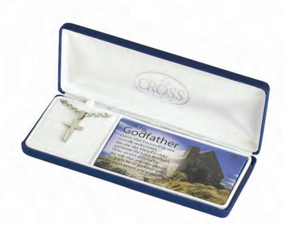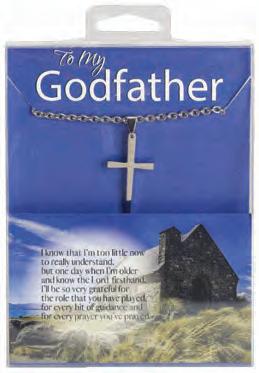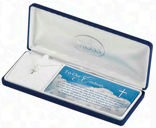 32-6731 Stainless Steel Box Cross measures 11/8”and hangs from a 24” chain. Packed in an electric blue hinged box with poem insert which reads: “I know that I’m too little now to really understand, but one day when I’m older and know the Lord firsthand, I’ll be so very grateful for the role that you have played, for every bit of guidance and for every prayer you’ve prayed.”