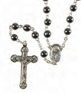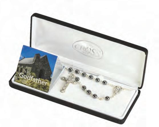 32-6733 Hematite Rosary Beads measure approximately 18” long. Beads are 6MM. Silver plated Madonna center and Crucifix which measures 1½”. Packed in a black hinged box. Tent card has a TO: and FROM: message area on the back. Message inside of card reads: “I know that I’m too little now to really understand, but one day when I’m older and know the Lord firsthand, I’ll be so very grateful for the role that you have played, for every bit of guidance and for every prayer you’ve prayed.” Makes the perfect gift for the baby’s Godfather.