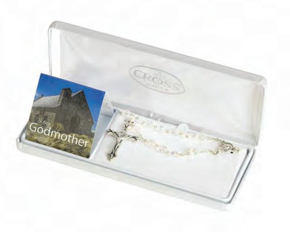 32-6732 Clear Glass Rosary Beads measure approximately 18” long. Beads are 5MM. Silver plated Madonna center and Crucifix which measures 1½”. Packed in a white hinged box. Tent card has a TO: and FROM: message area on the back. Message inside of card reads: “I know that I’m too little now to really understand, but one day when I’m older and know the Lord firsthand, I’ll be so very grateful for the role that you have played, for every bit of guidance and for every prayer you’ve prayed.” Makes the perfect gift for the baby’s Godmother.