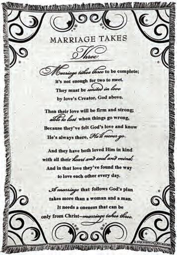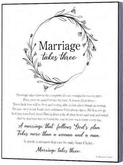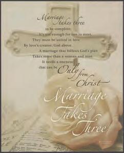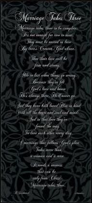 Marriage takes three to be complete; It's not enough for two to meet. They must be united in love by love's Creator, God above. Then their love will be firm and strong; able to last when things go wrong, because they've felt God's love and know He's always there, He'll never go. And they have both loved Him in kind with all their heart and soul and mind; and in that love they've found the way to love each other every day. A marriage that follows God's plan takes more than a woman and a man. It needs a oneness that can be only from ChristMarriage takes three.