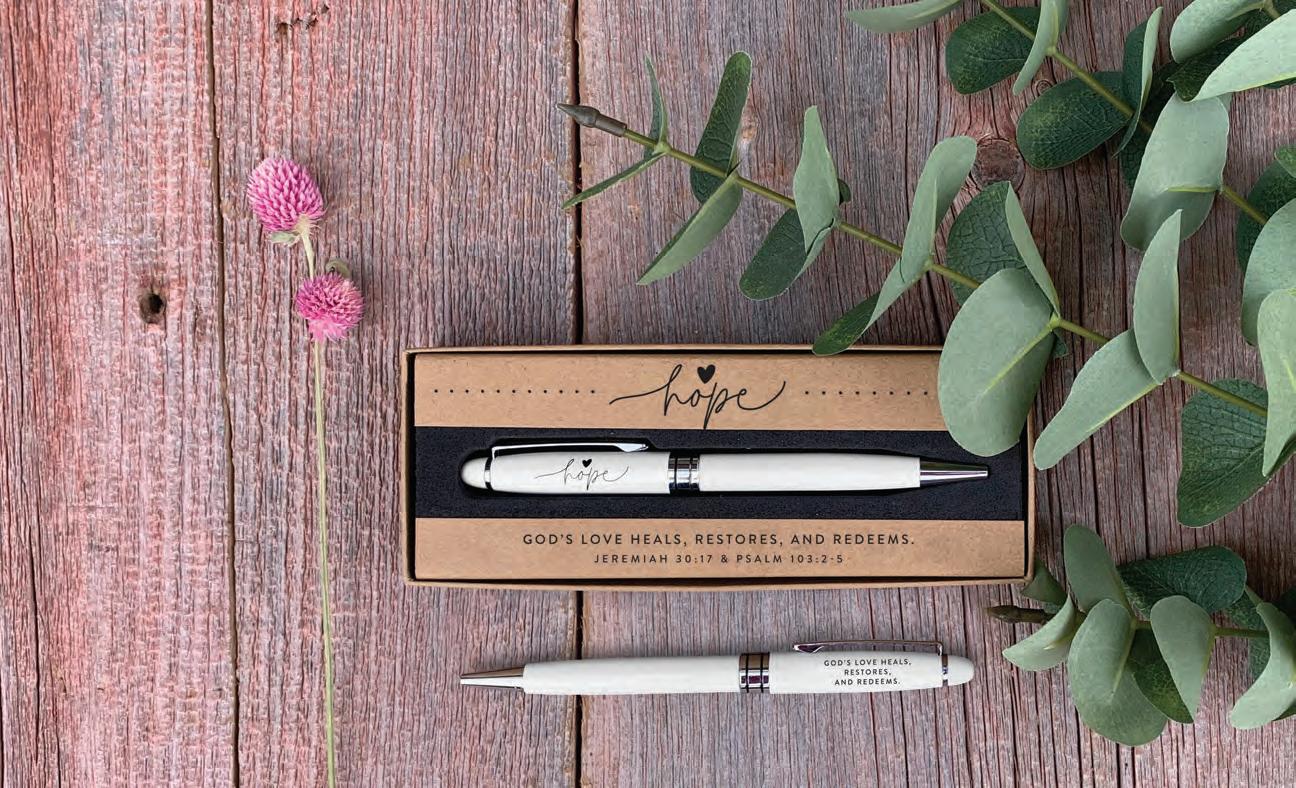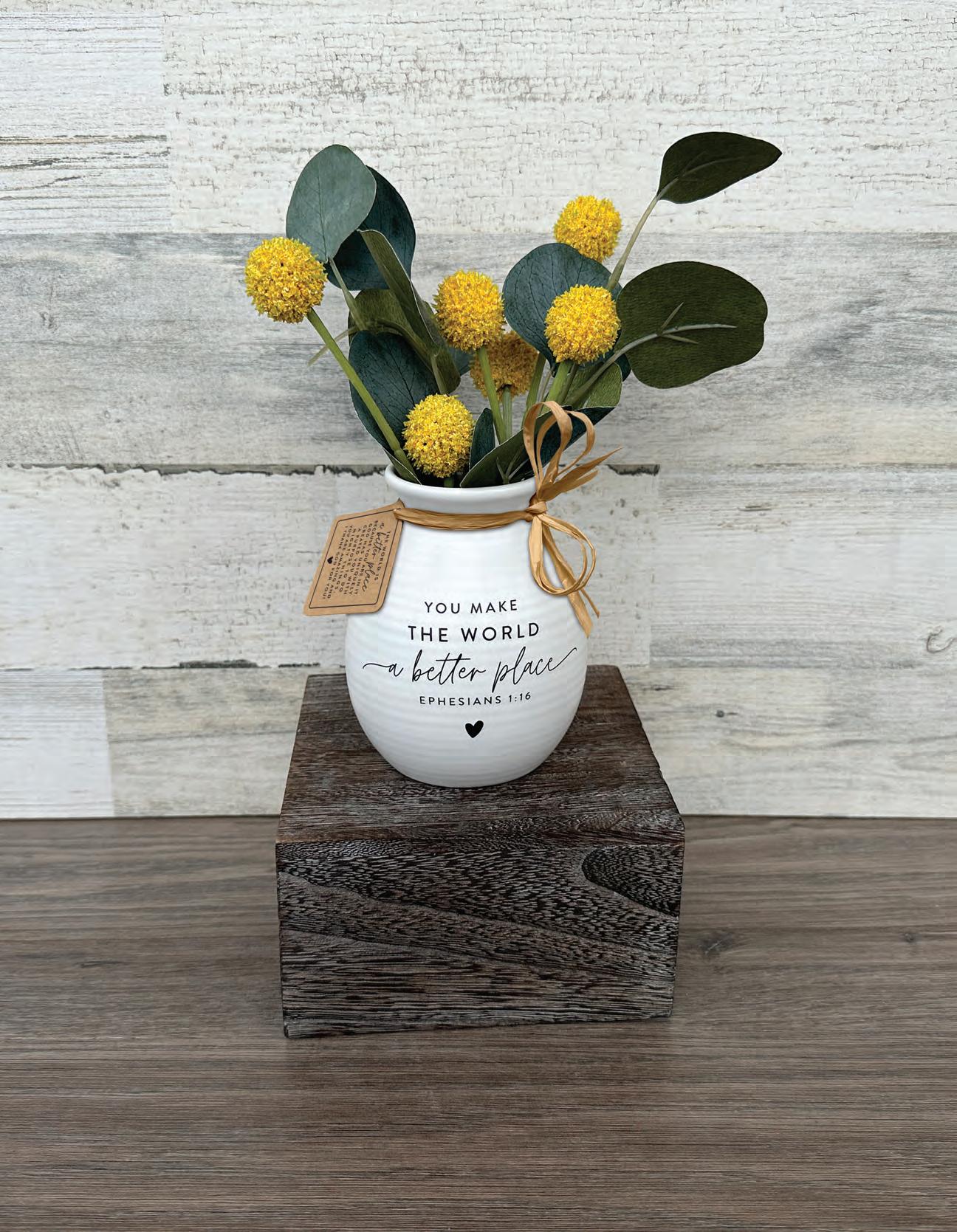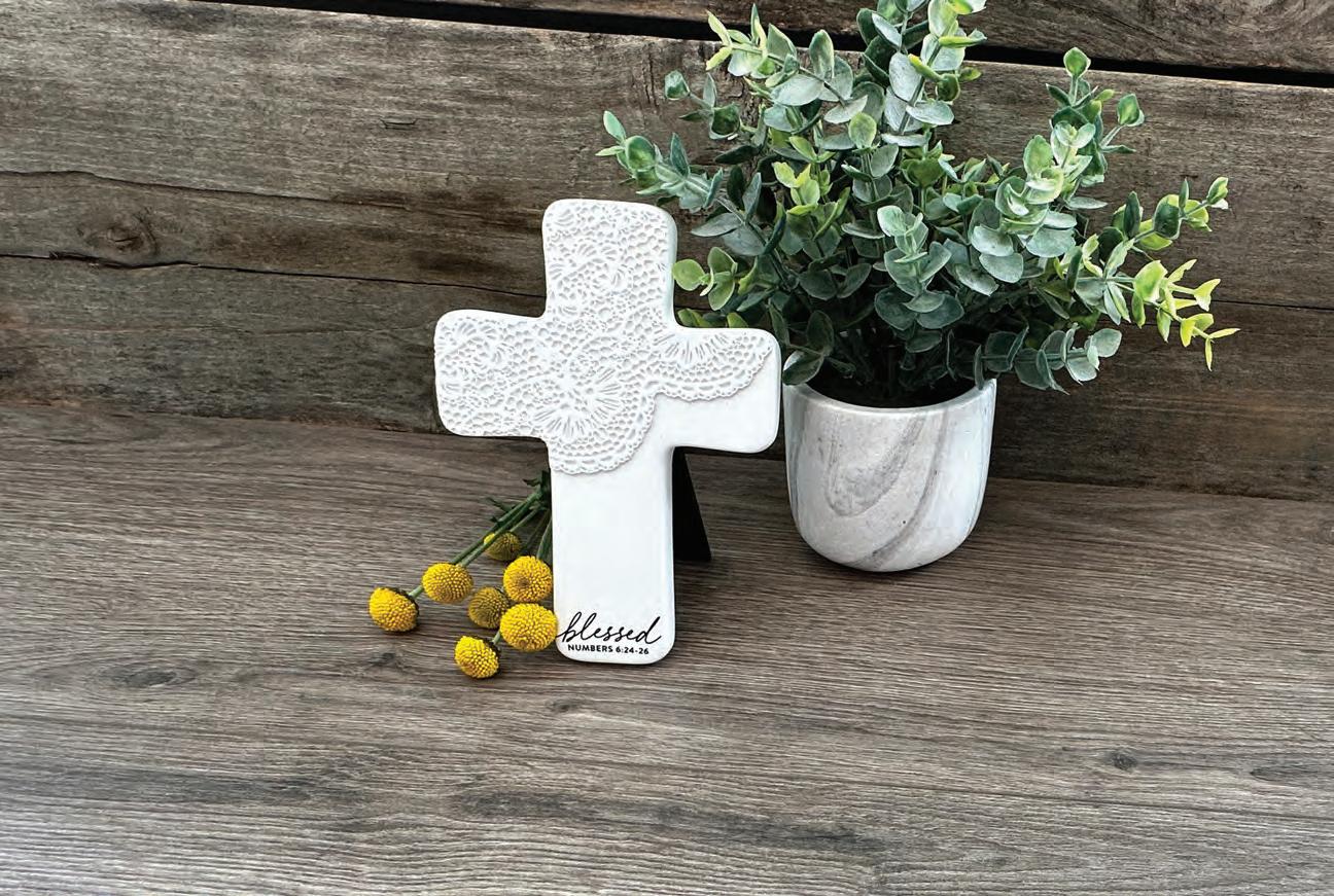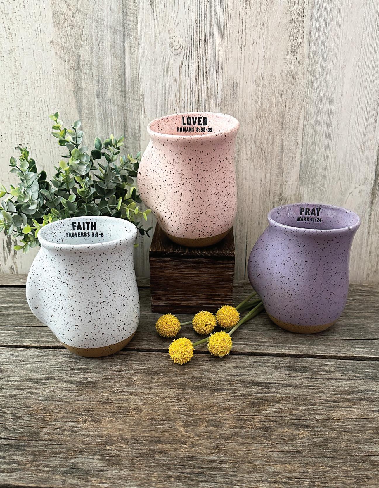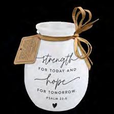 Features: printed title and Scripture, finished with a raw ceramic bottom, gift tag