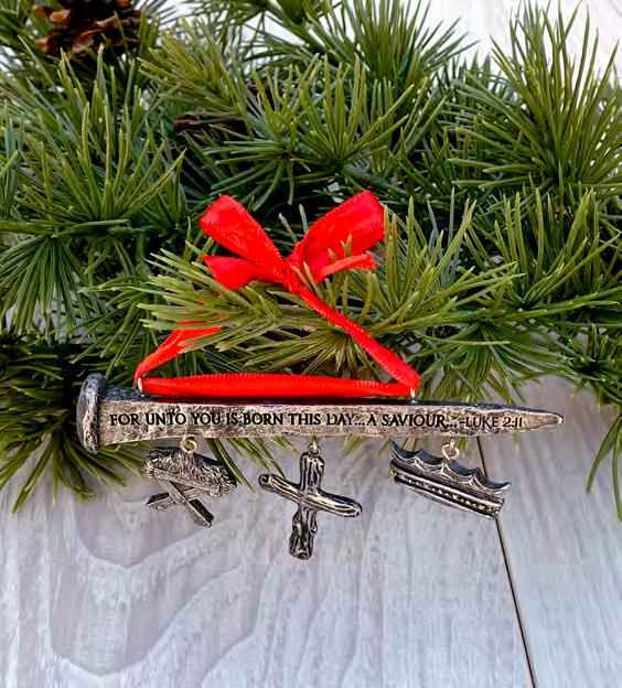 Features: nail with engraved Scripture, 3 hanging charms: manger, cross, crown; ribbon to hang