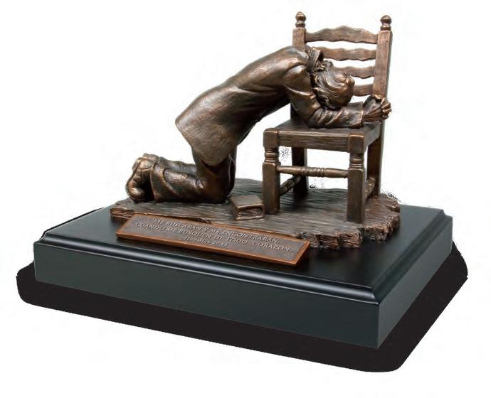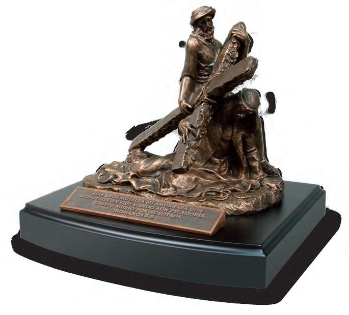 Features: bronzelike finish, engraved Scripture on Bible, ribbon to hang