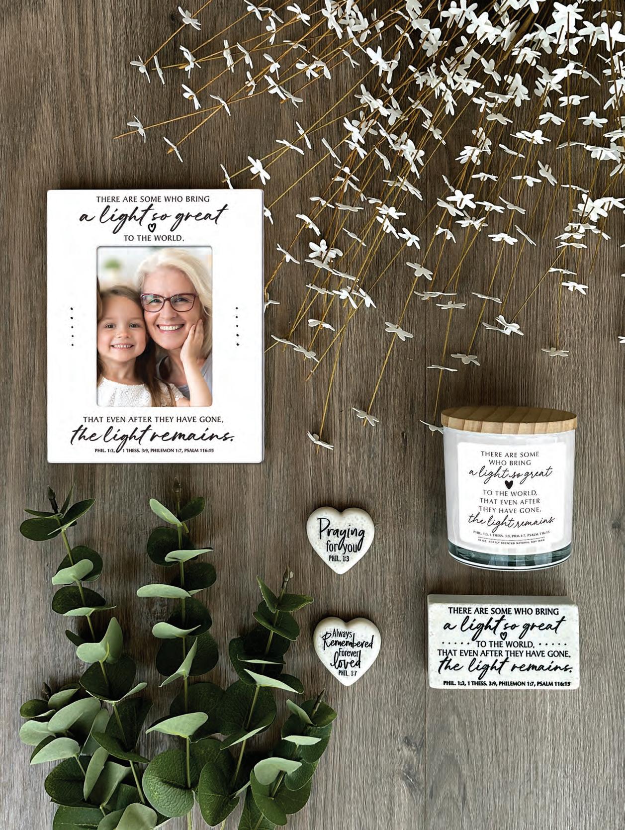 Distributed by Partnering together to serve you better 2024 Supplement 1 4 Candles .................................................................................... 16 Bereavement 23 Backlist Categories Crosses 24 Drinkware: Mugs, Handwarmers, Tumblers ........................... 35 Kit chen & Dining ......................................................................... 69 Pe ns 77 Ph oto Frames 82 Pl aques & Framed Art ................................................................ 87 Scriptu re Stones & Keepsake Boxes ...................................... 113 Sculptures 123 S panish (Español) 135 Christmas Gifts 2024 ..................................................................... 147 I ndex 180 Drinkware is microwave and dishwasher safe, excluding lids. TABLE OF CONTENTS LIGHTHOUSE® christian products More an Just A Gift... Not to us, O LORD, not to us, but to your name goes all the glory for your unfailing love and faithfulness. Psalm 115:1 CATALOG24LCP 1 2 3 4 5 6 7 8 9 10 11 CUSTOMER SERVICE: 800-457-9885 FAX: 800-875-5305 Canada Only: (888) 472-5550 E-MAIL: cservice_orders@dicksonsgifts.com WEBSITE: dicksonsgifts.com 3