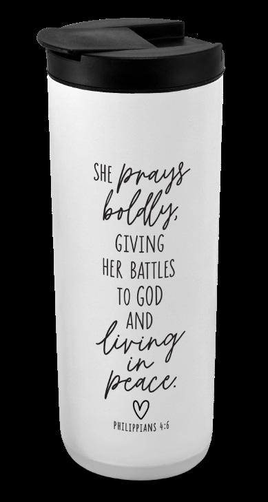 Features: printed title and Scripture, double-wall vacuum insulated stainless steel with leak-proof plastic lid, non-slip silicone pad on the base helps grip surfaces to avoid spills and scratches. Keeps drinks cold for 12 hours and hot for 7 hours.