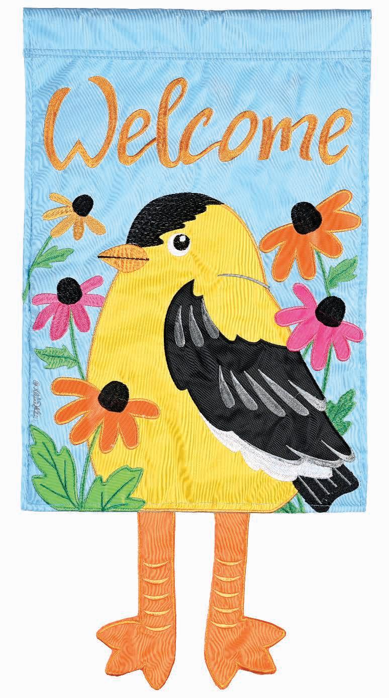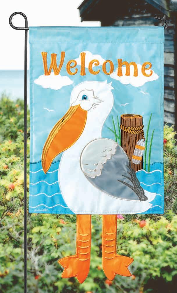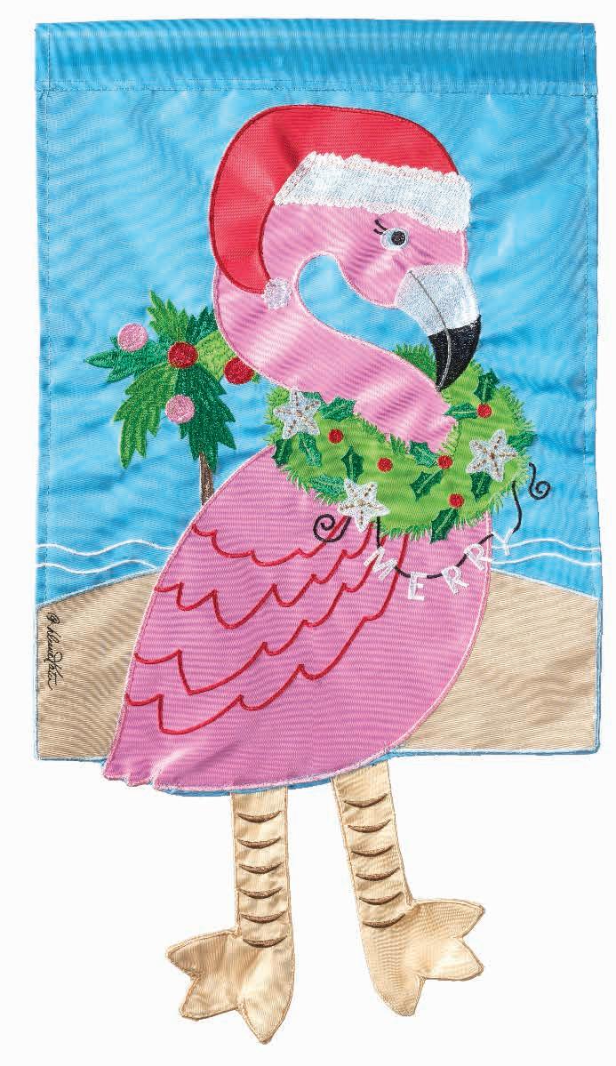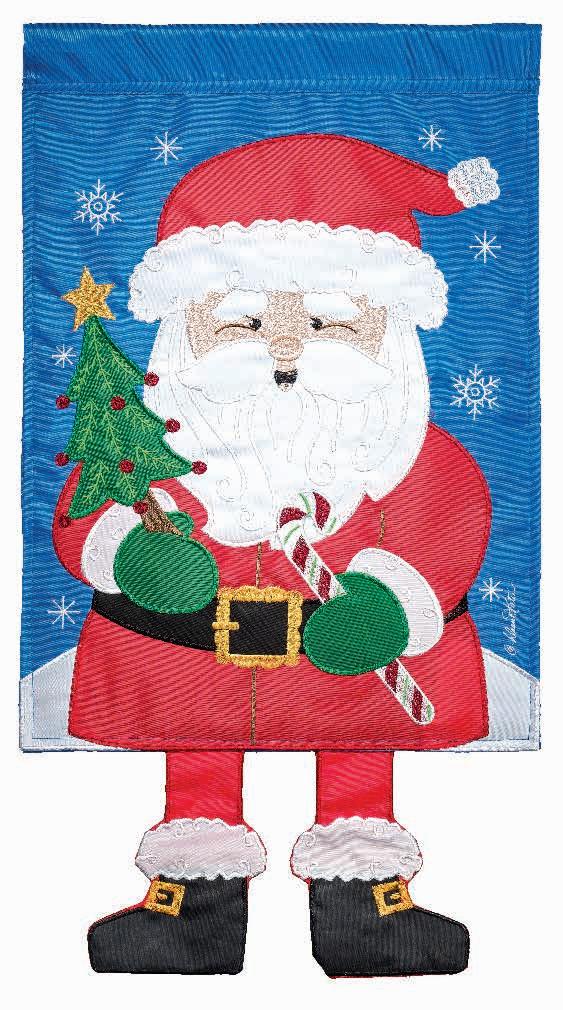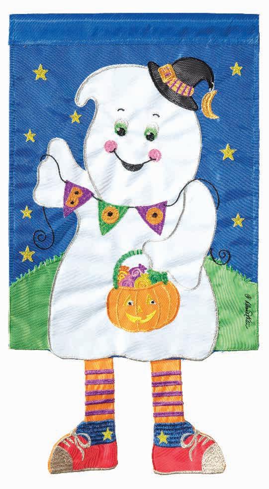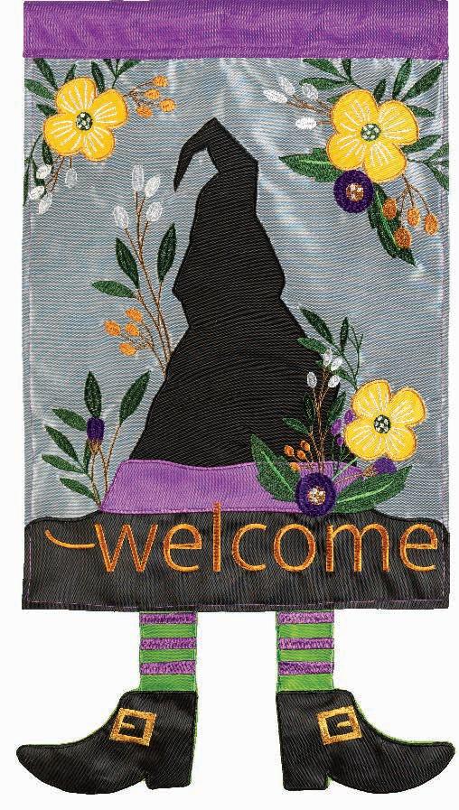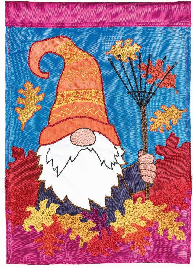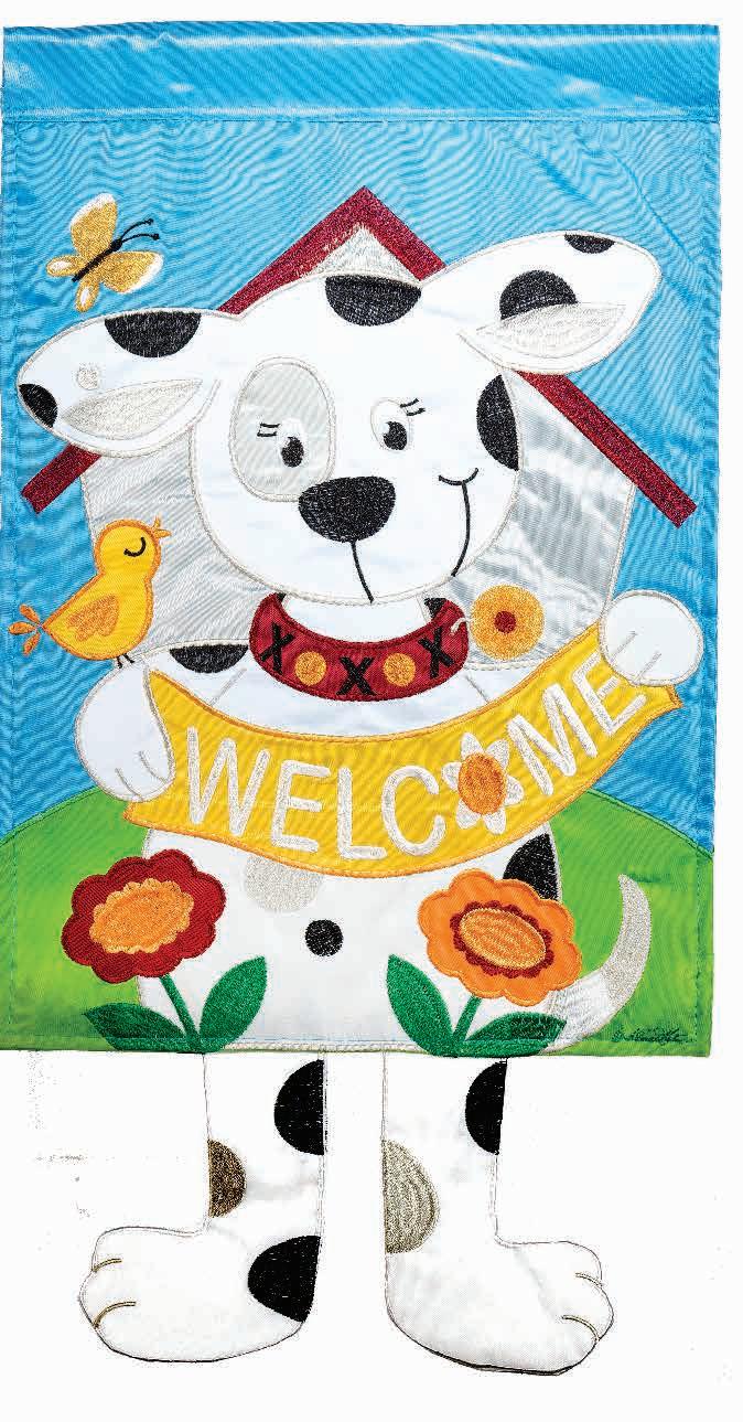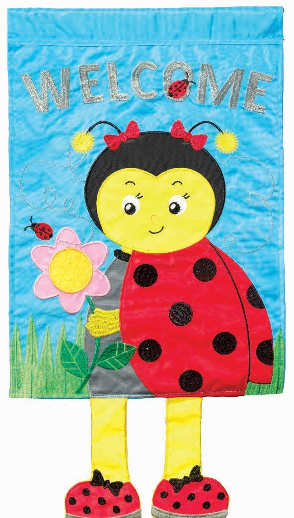 DOUBLE APPLIQUE CRAZY LEGS FLAGS Leg dangles add extra fun to the whimsical characters on these seasonal garden flags! Dangles are 6”long on a 13”x18”H flag, and appear the same on both sides. Available in Garden size only.