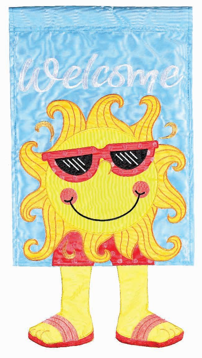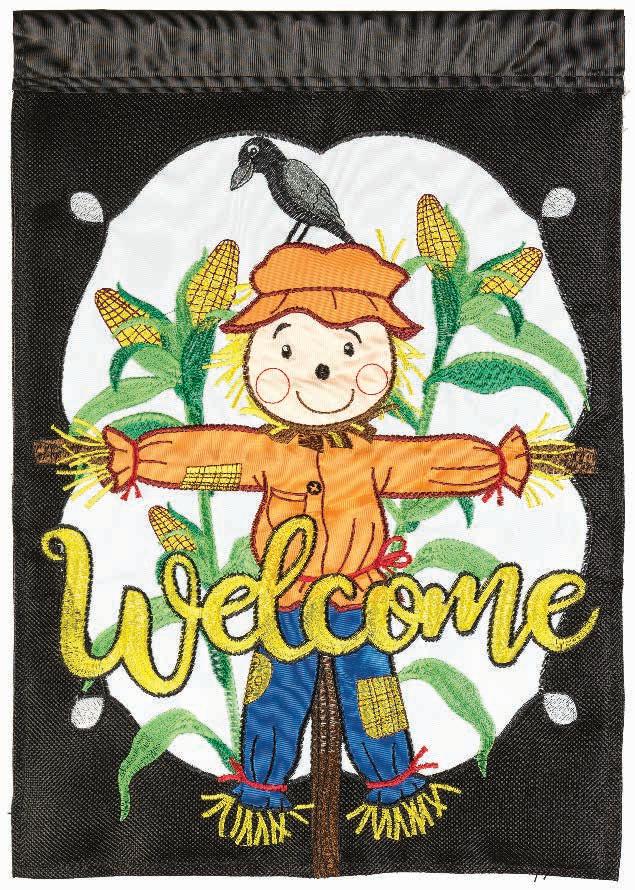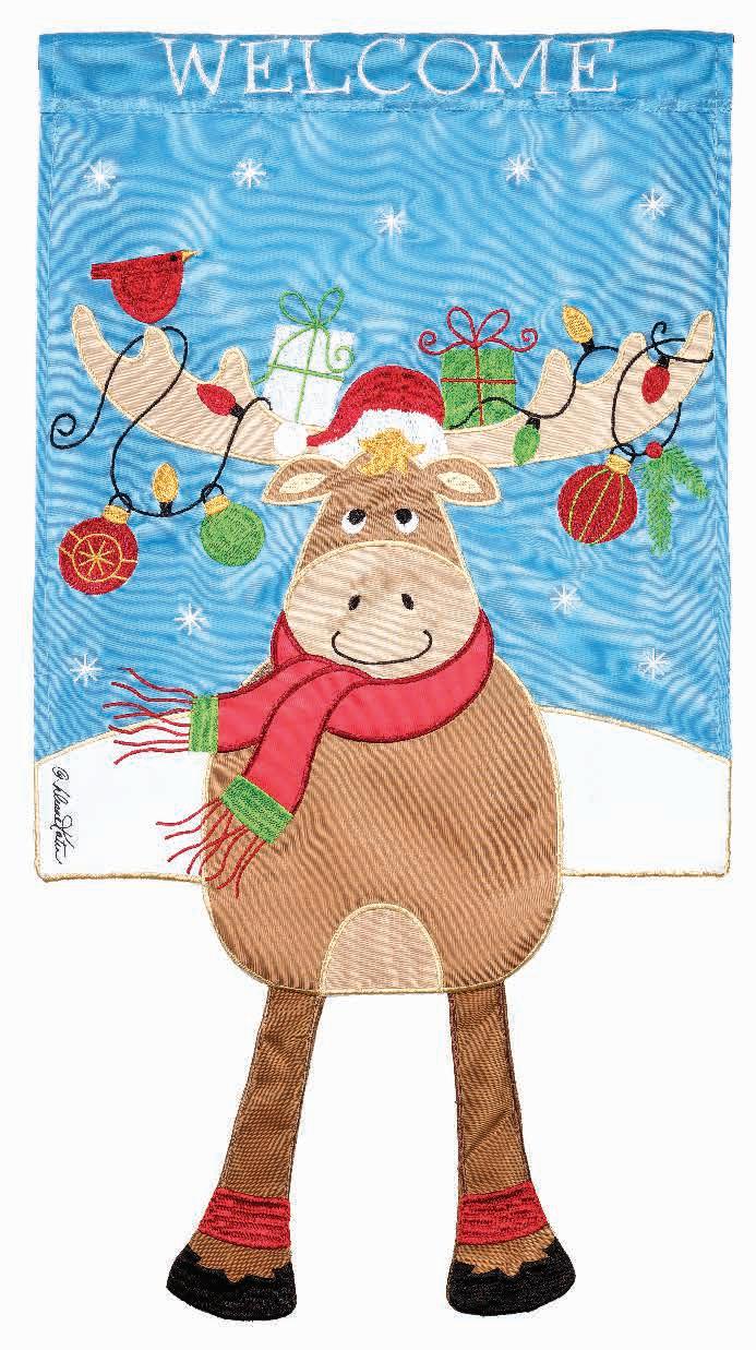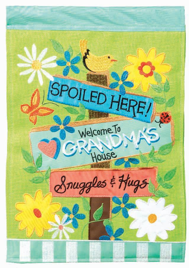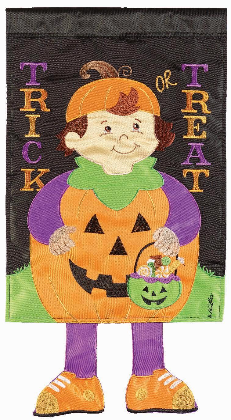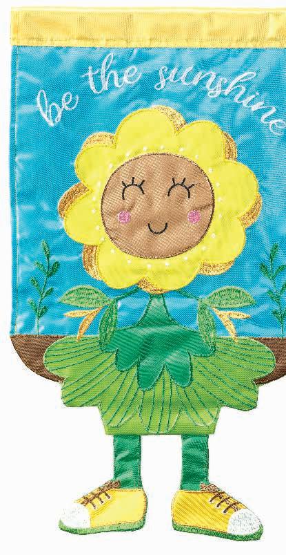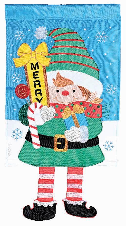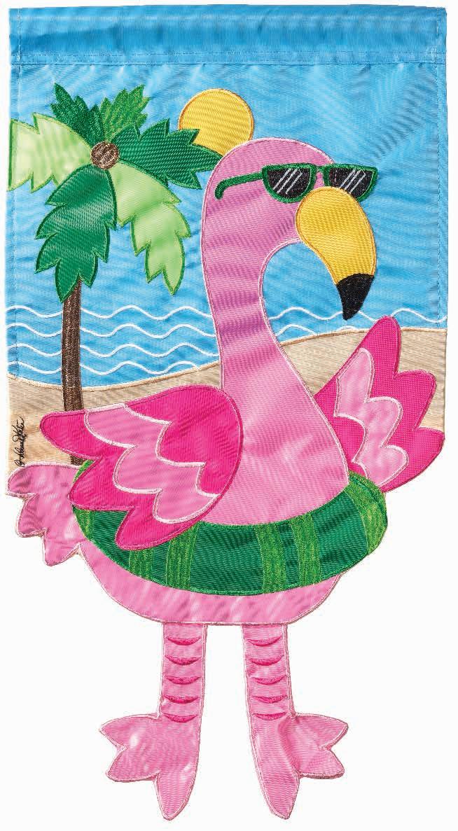 DOUBLE APPLIQUE CRAZY LEGS FLAGS Leg dangles add extra fun to the whimsical characters on these seasonal garden flags! Dangles are 6”long on a 13”x18”H flag, and appear the same on both sides. Available in Garden size only.