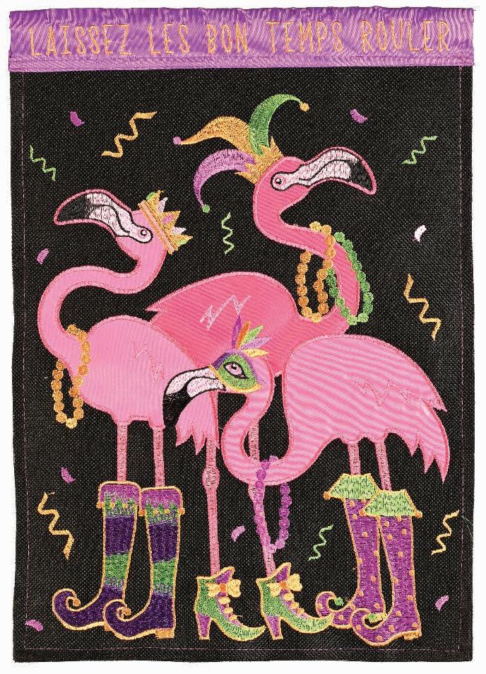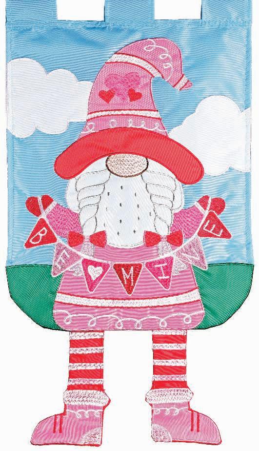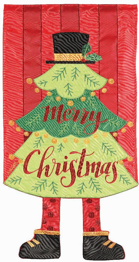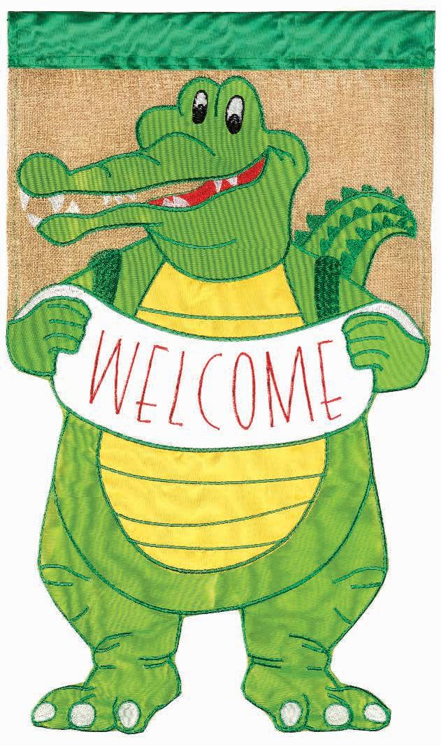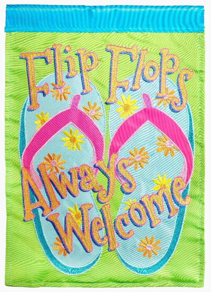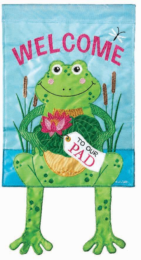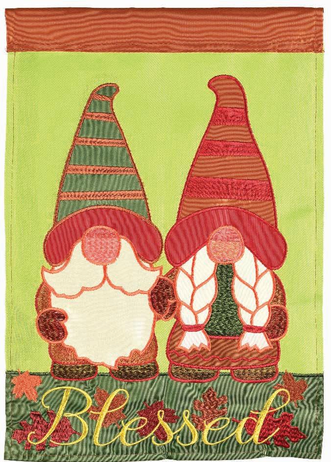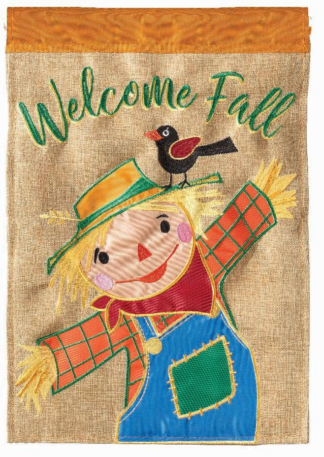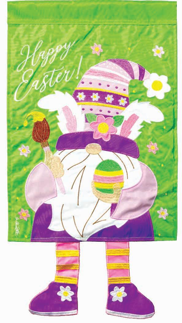 DOUBLE APPLIQUE CRAZY LEGS FLAGS Leg dangles add extra fun to the whimsical characters on these seasonal garden flags! Dangles are 6”long on a 13”x18”H flag, and appear the same on both sides. Available in Garden size only.