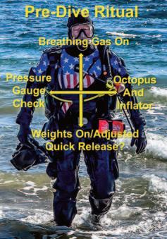 This is something that I go through before my diving companion and I actually get in the water. I call it my “Safety Cross.” If you see me crossing myself before a dive, I’m not praying (after all, if I have to pray, I probably should not be making that dive!). I’m checking to make sure that everything is ready for the dive I’m going to make.