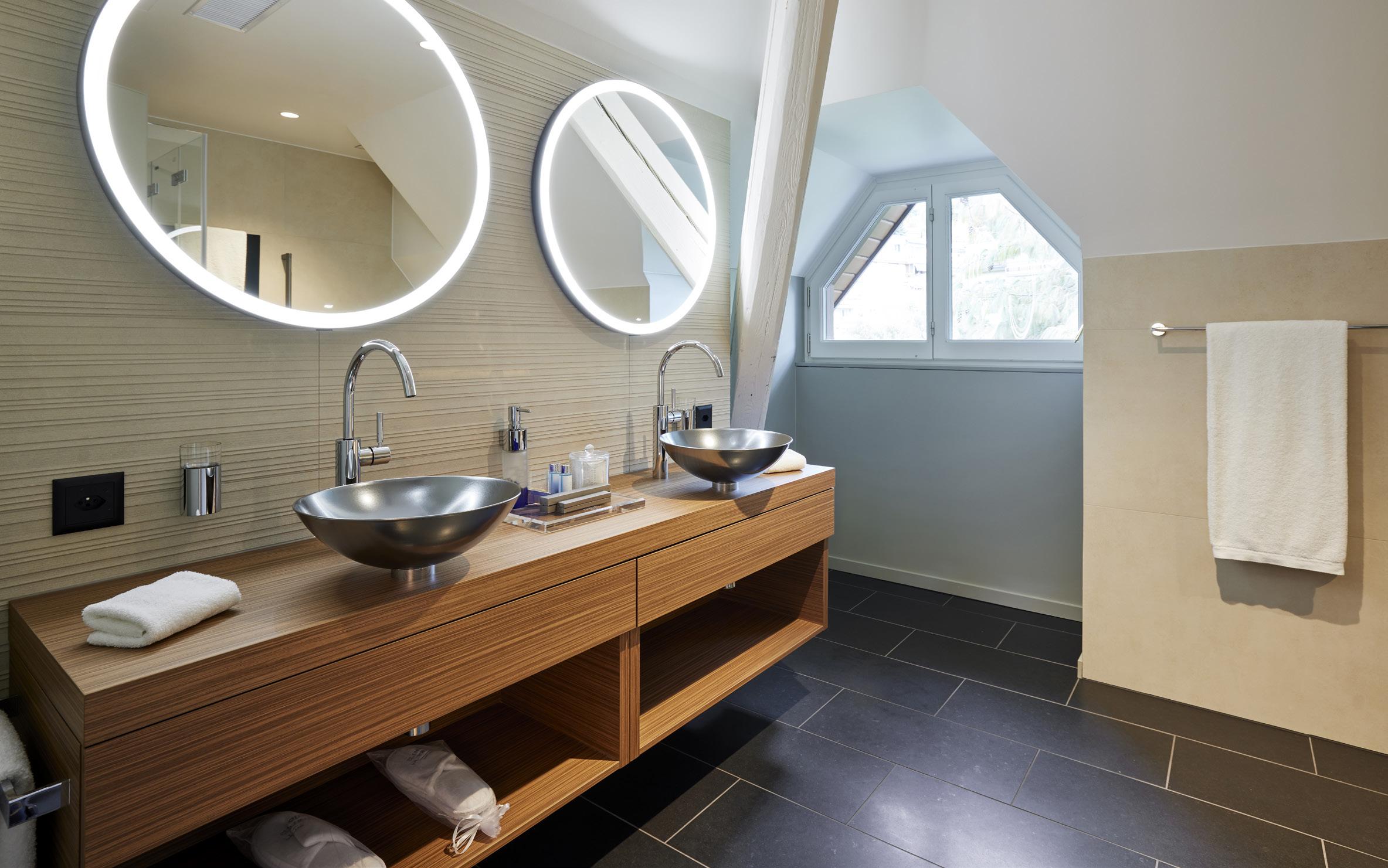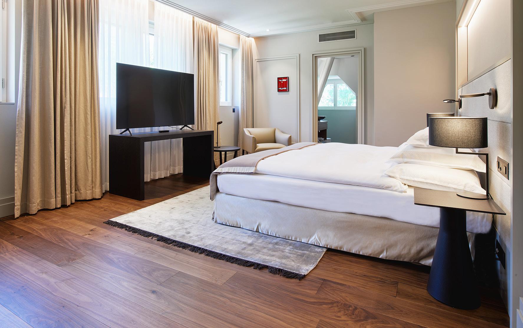 These rooms are very spacious, incorporating a lounge area. Ideally located in the wings of the Château, the deluxe rooms have many windows opening onto the garden, lake and Alps for a perfect view all day long.