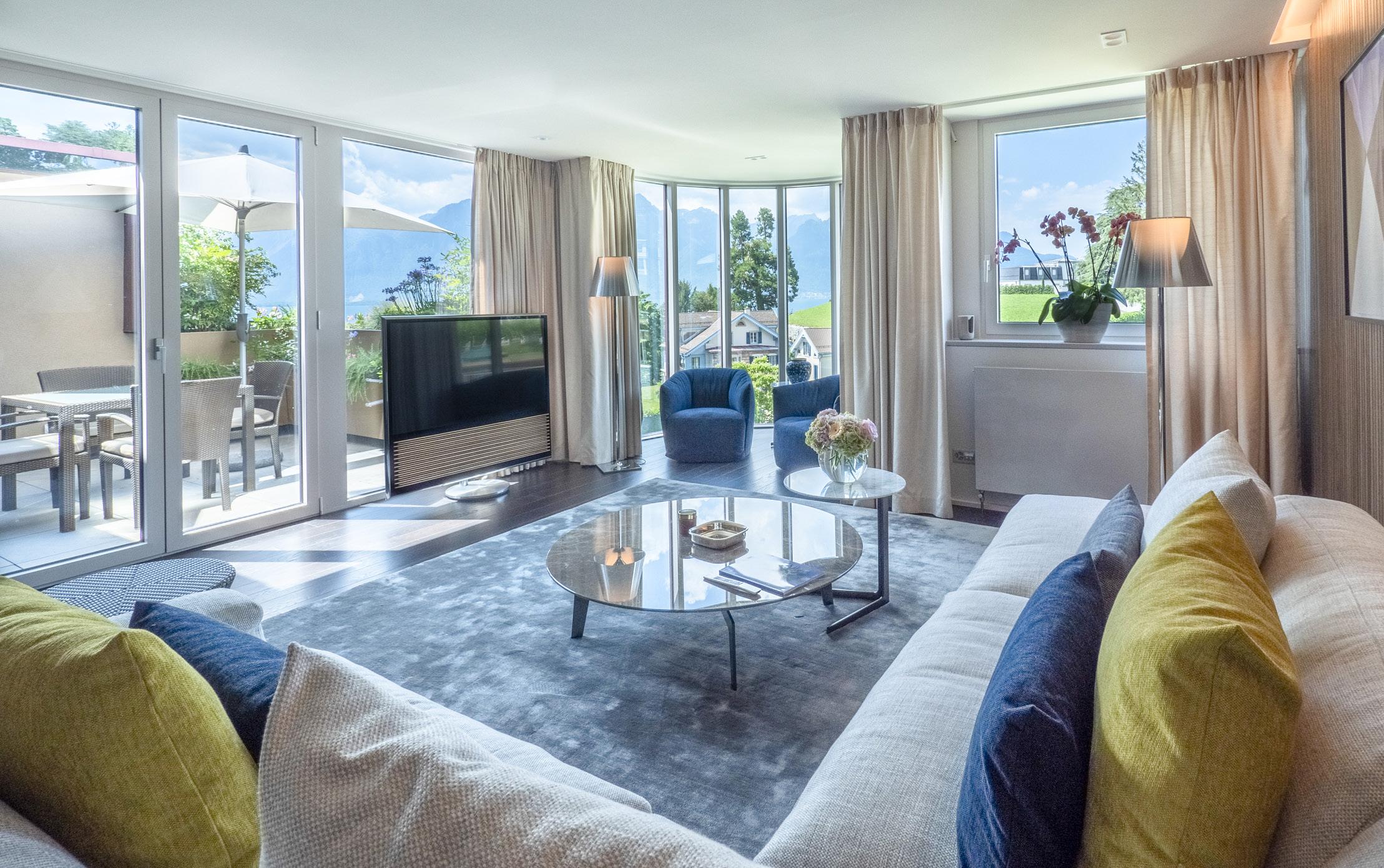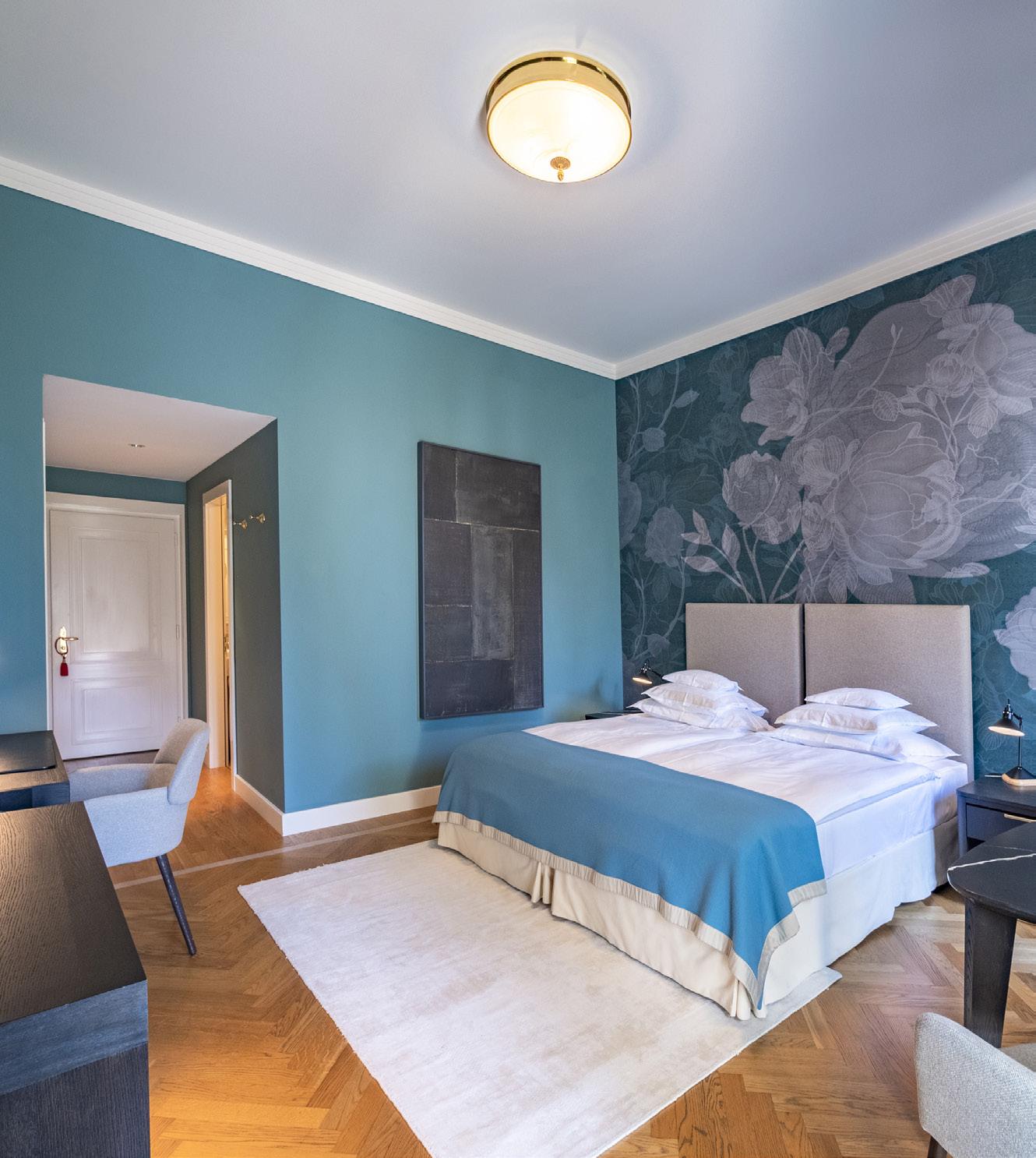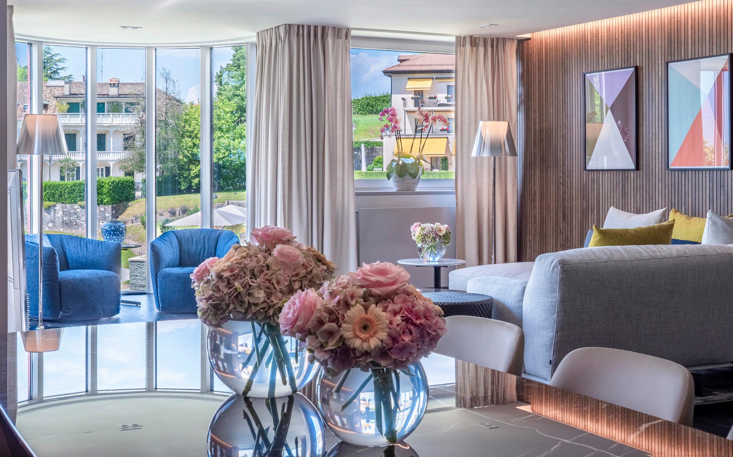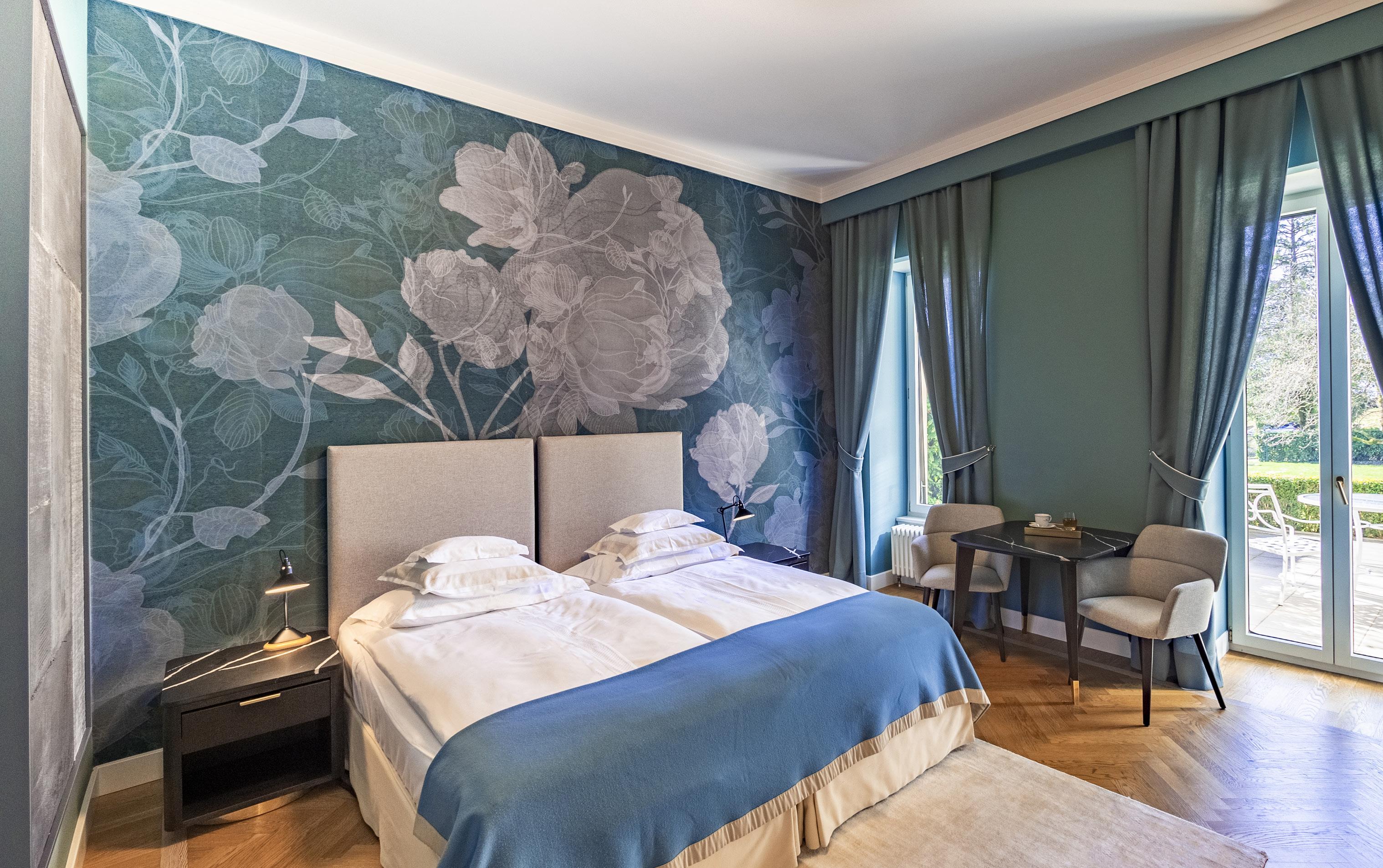 Modern furniture in tones of blue and green inspired by Lac Léman. These spacious rooms offer a superb view of the lake and Alps.