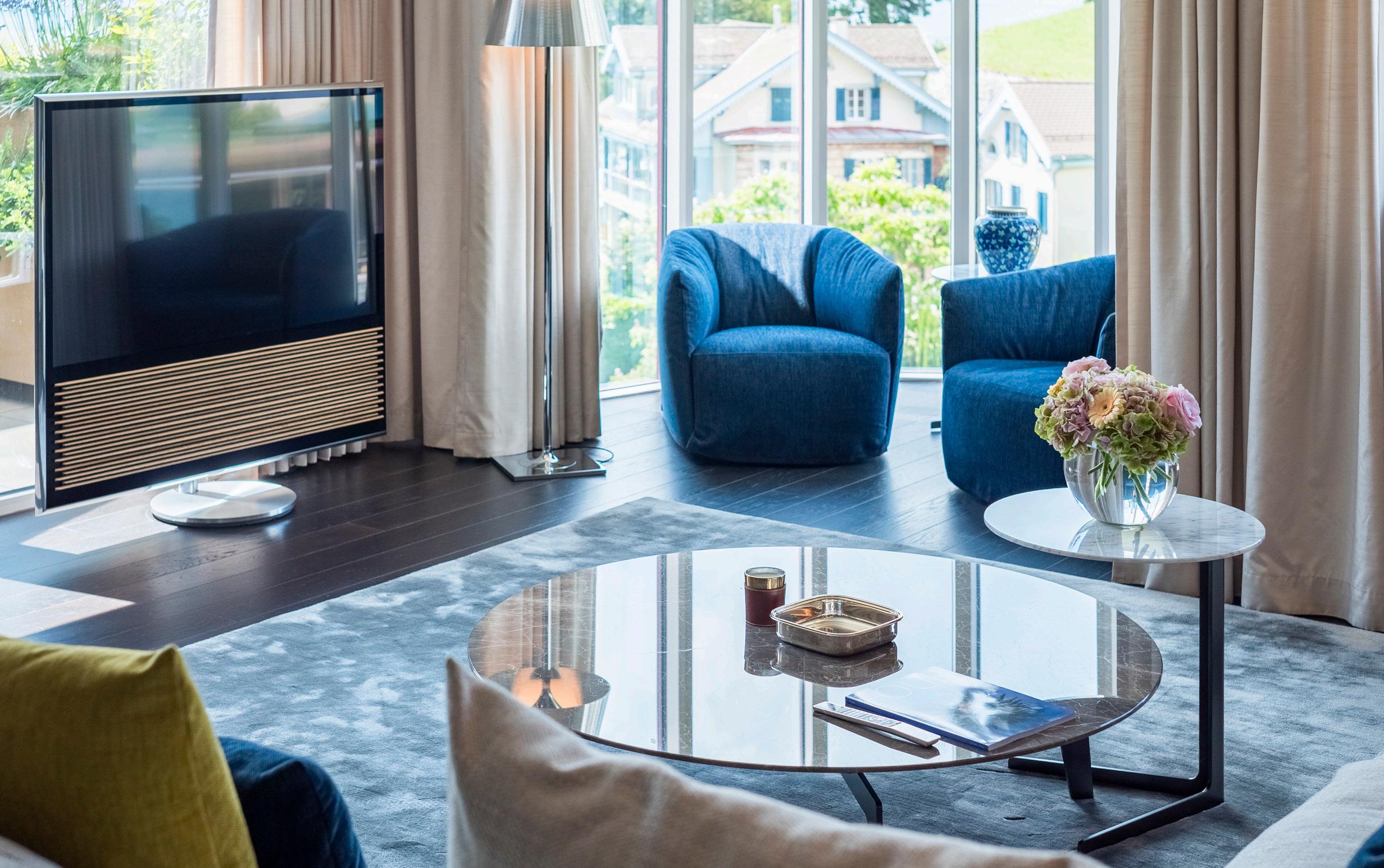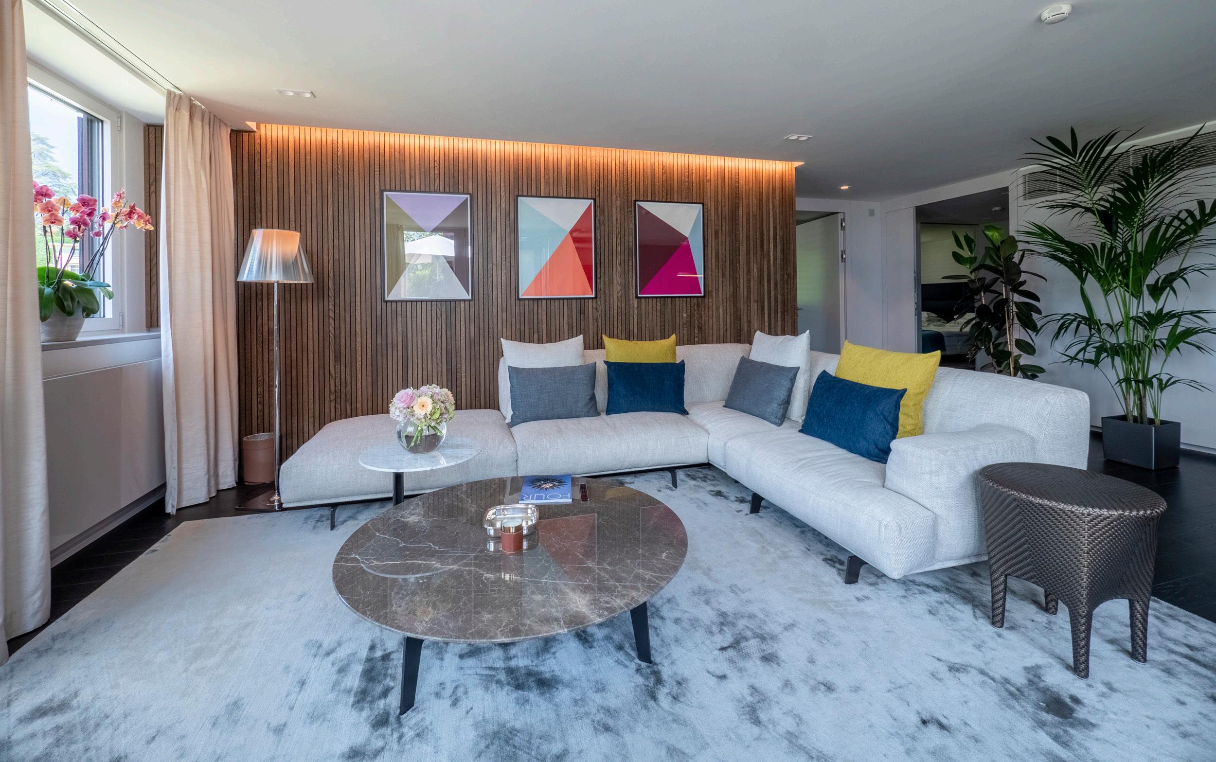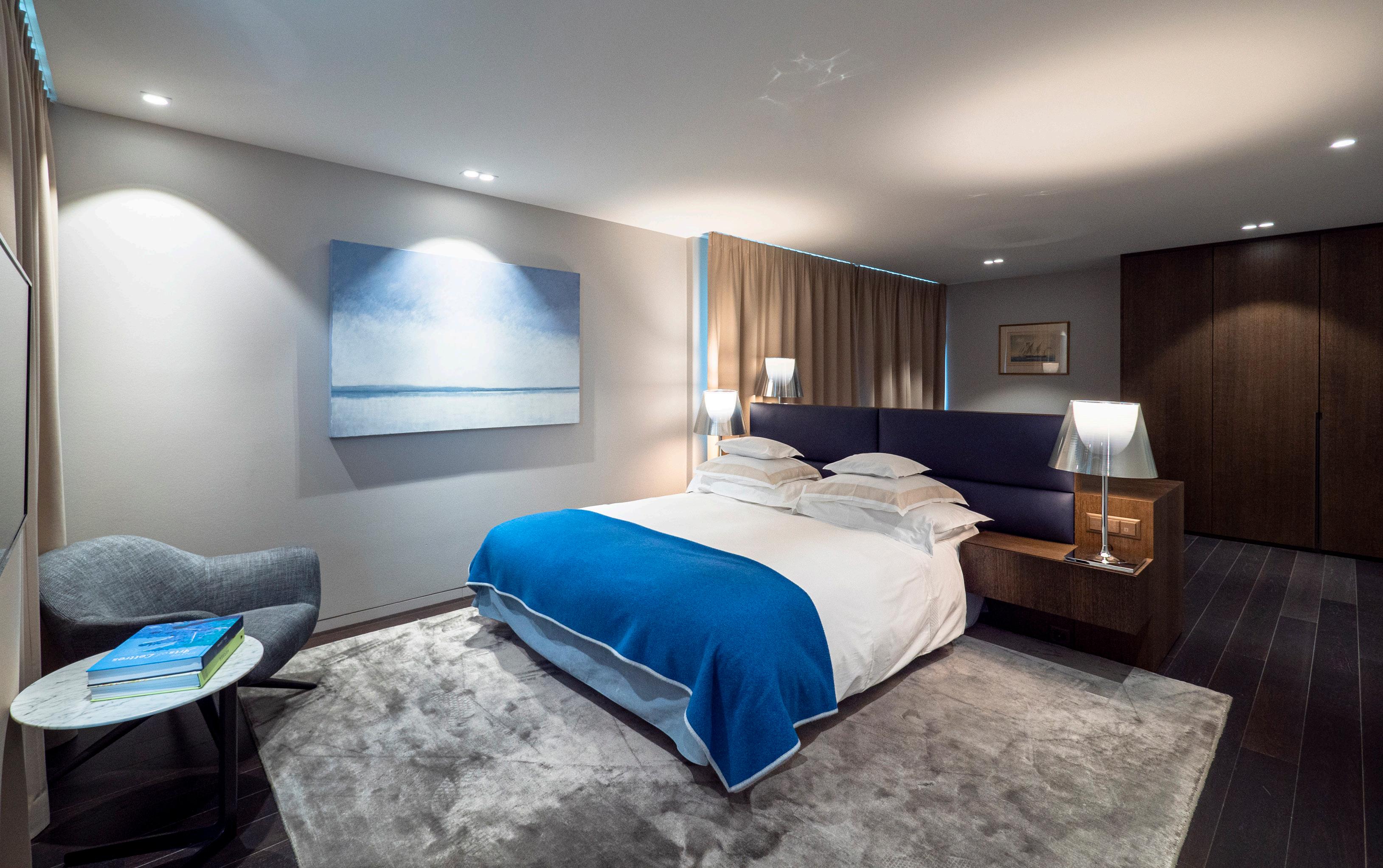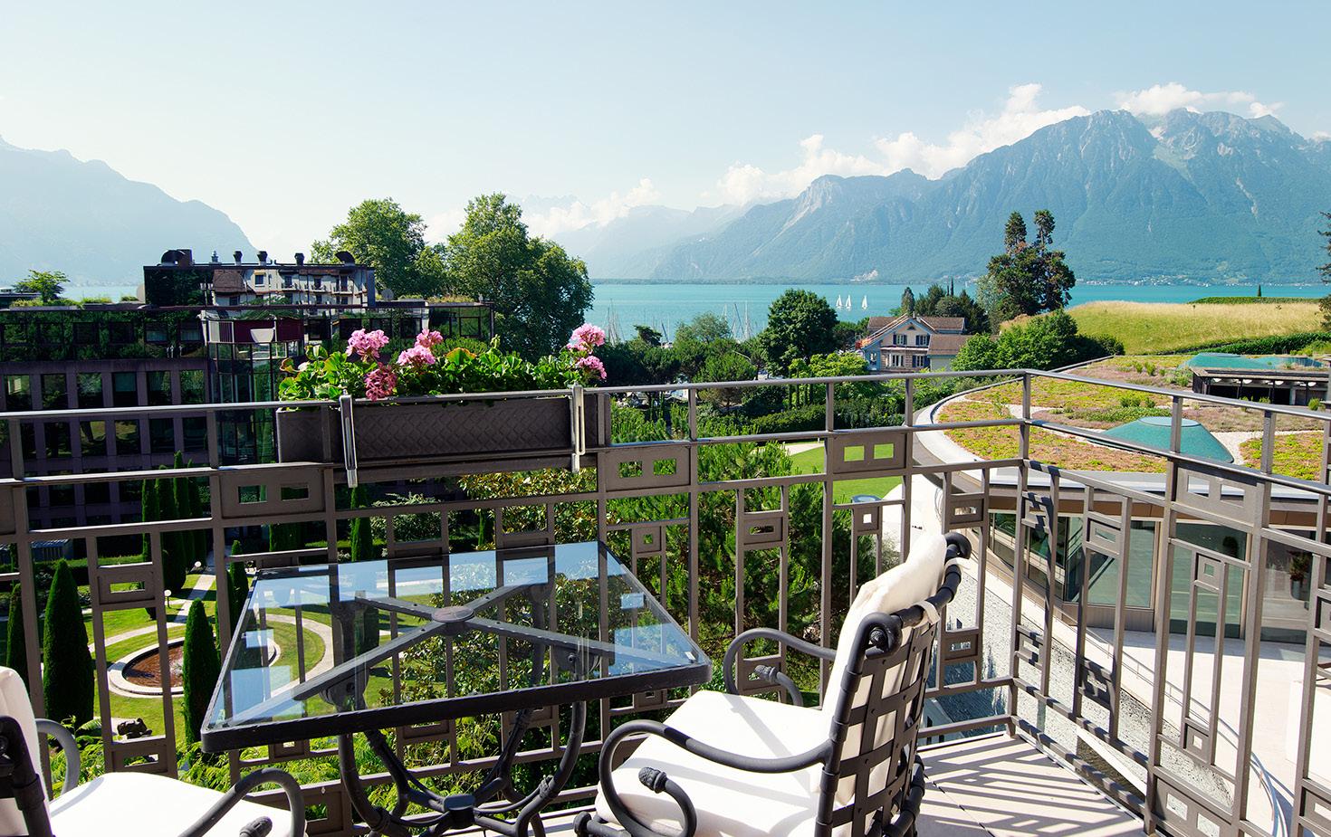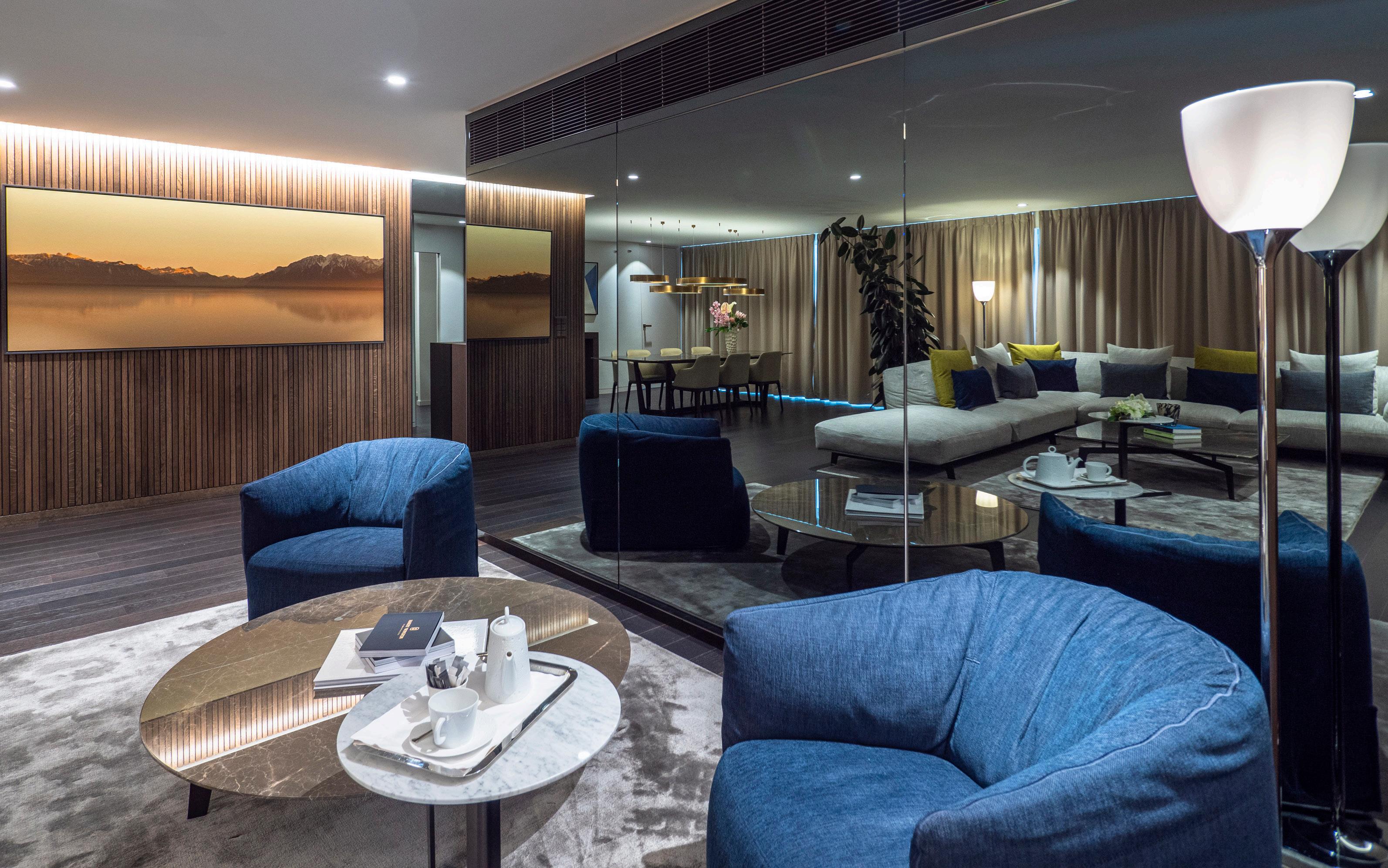 Modern furniture in tones of blue and green inspired by Lac Léman. These spacious rooms offer a superb view of the lake and Alps.
