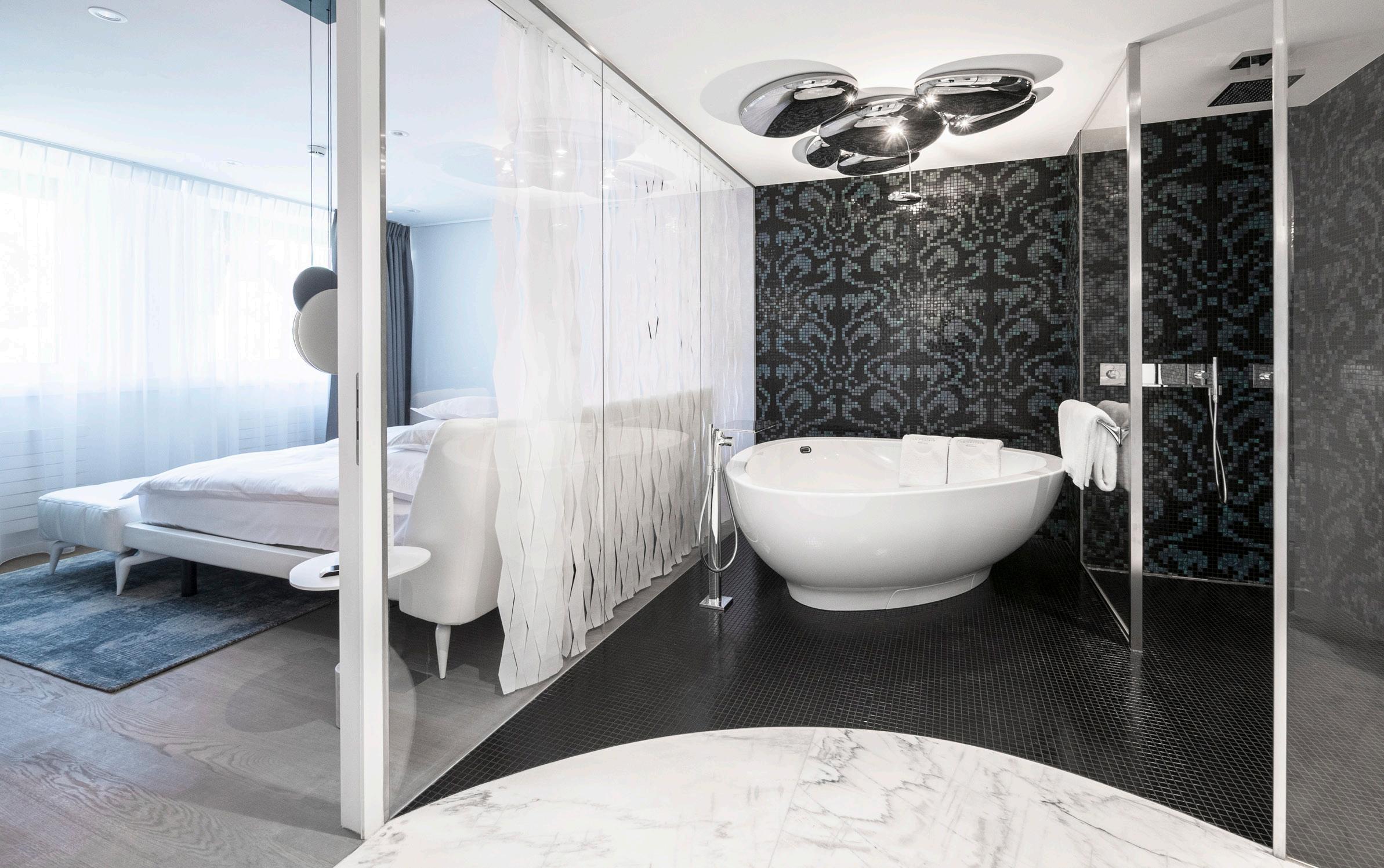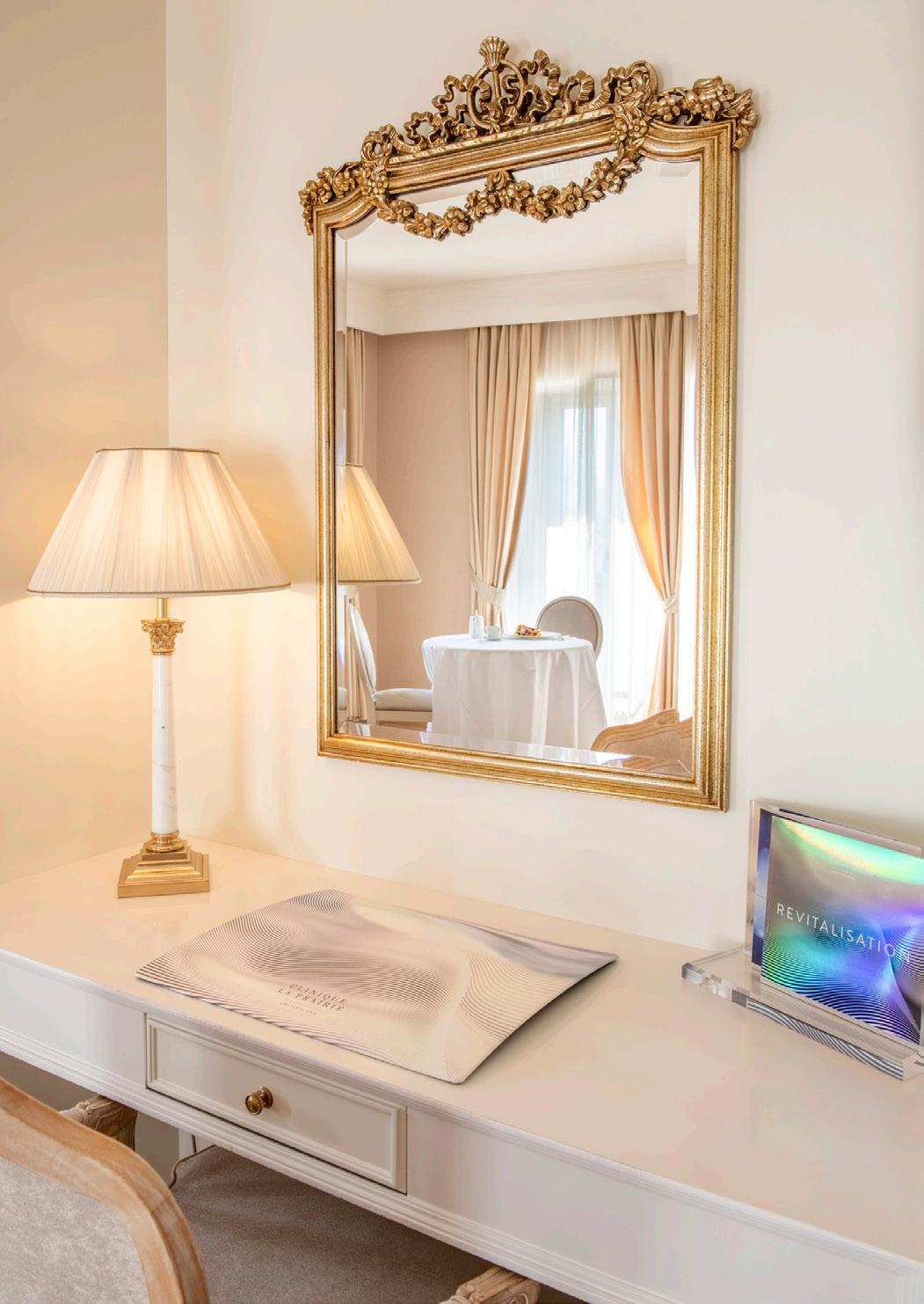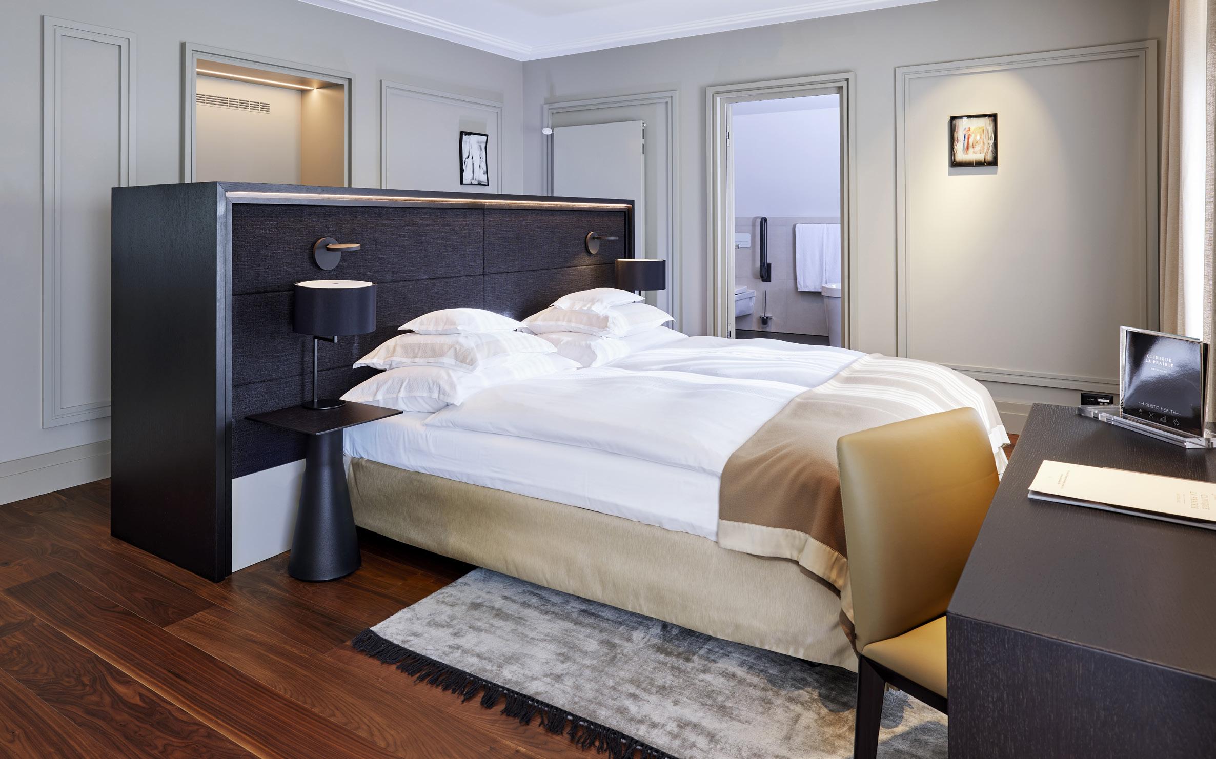 On the top floor – the sixth – in a secluded part of the clinic where tranquility reigns, the Imperial Suite’s special features include a unique, private terrace with a panoramic view over the lake and the port of Clarens. A private elevator takes guests directly to the suite.