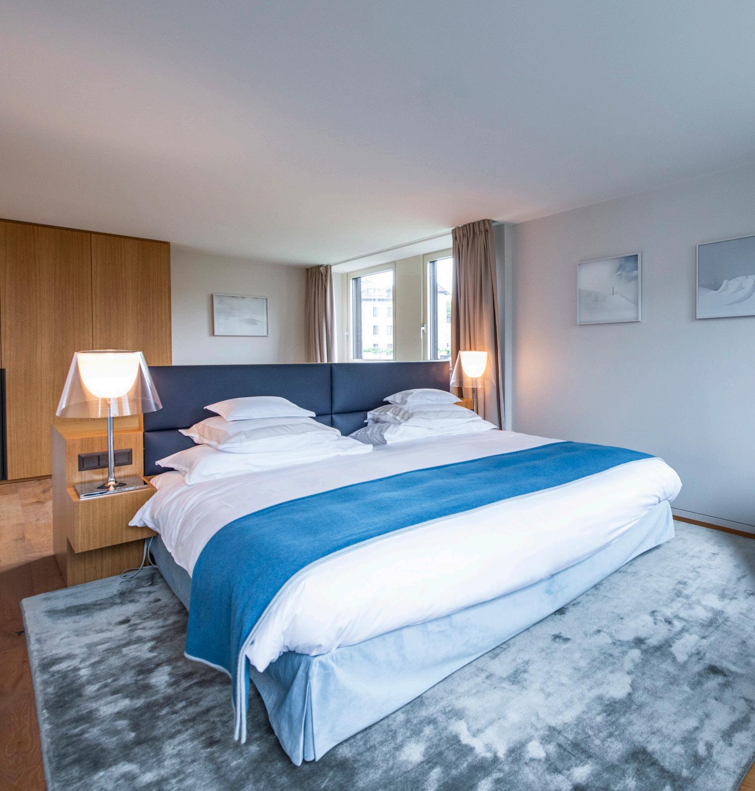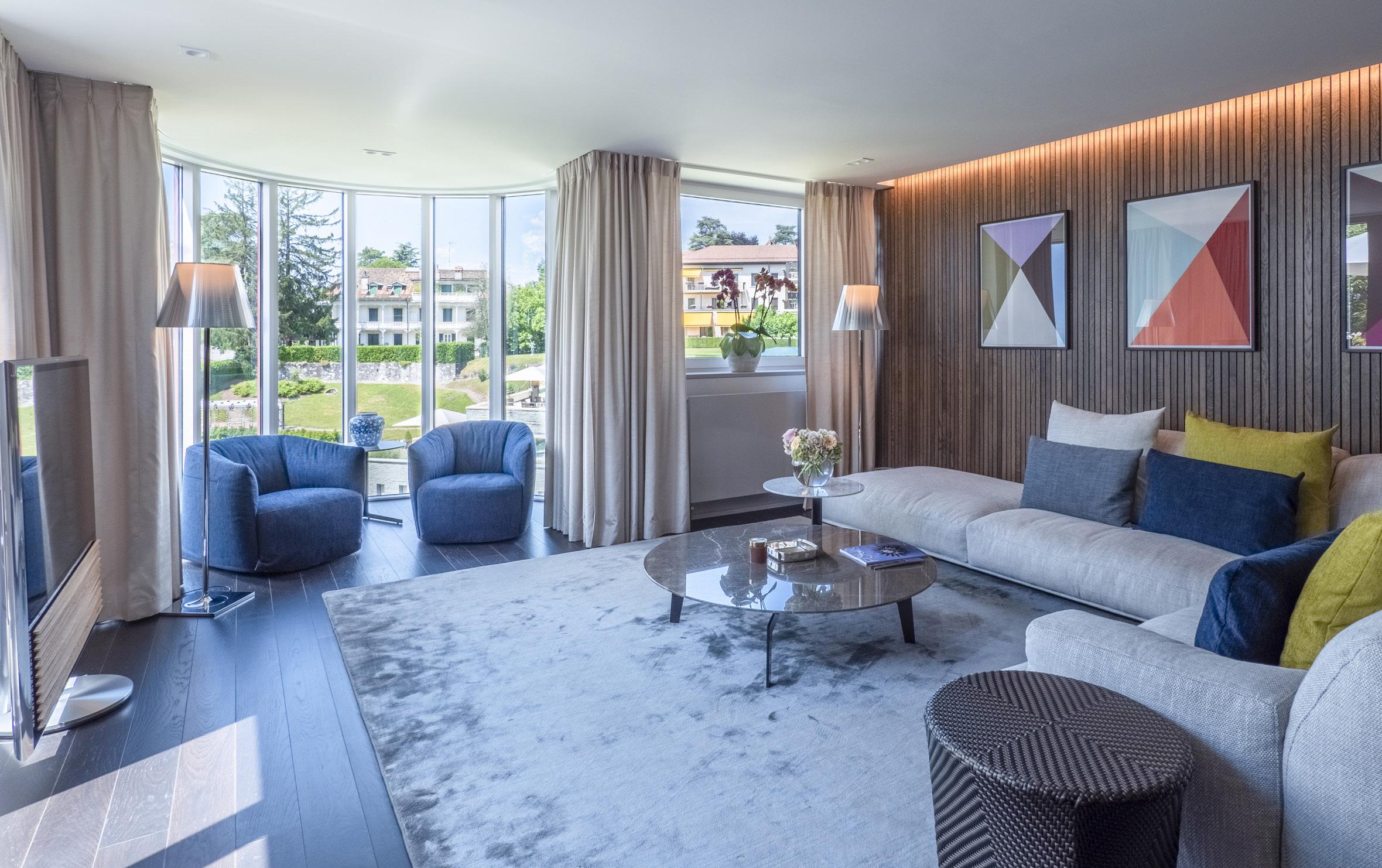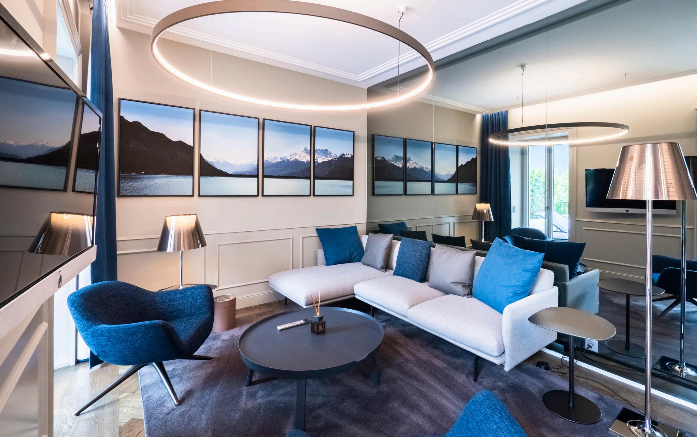 Modern furniture in tones of blue and green inspired by Lac Léman. These spacious rooms offer a superb view of the lake and Alps.